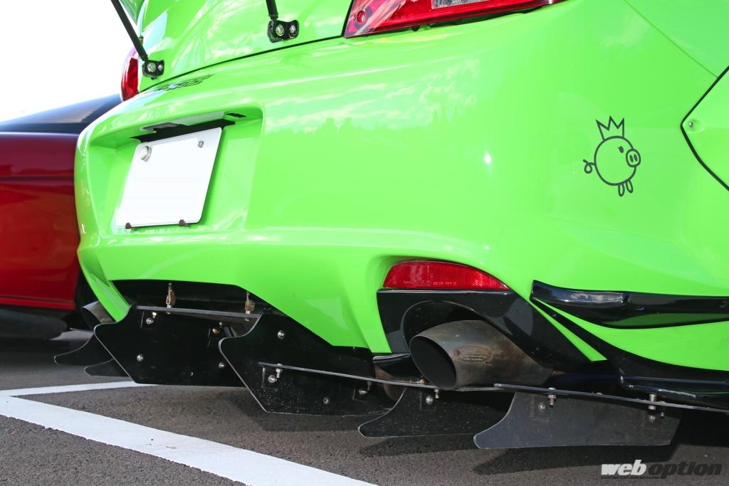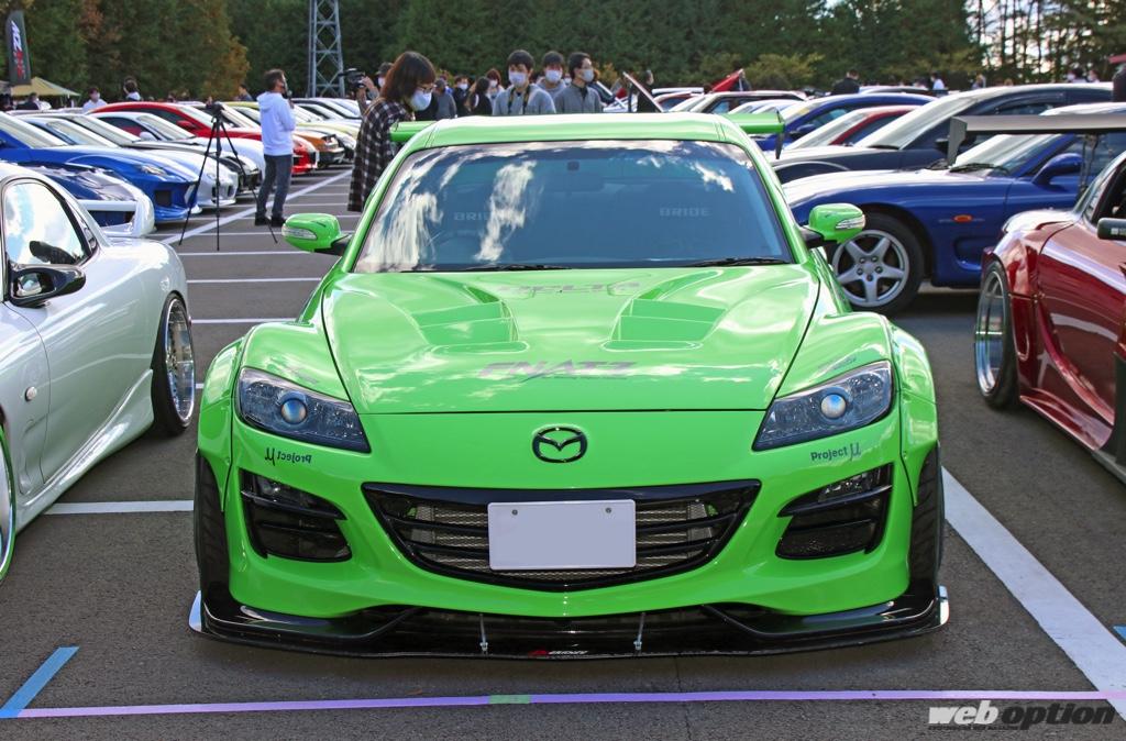 ロケットバニーのワイドボディキットを中心としたボディワークは、ロータリースポーツファンにはお馴染みのガレージヤマグチが手がけたもの。鮮やかなグリーンのカラーリングはオーナーが希望していたものではなく、オートサロンに間に合わるための“お任せ”の結果だったとか…。
