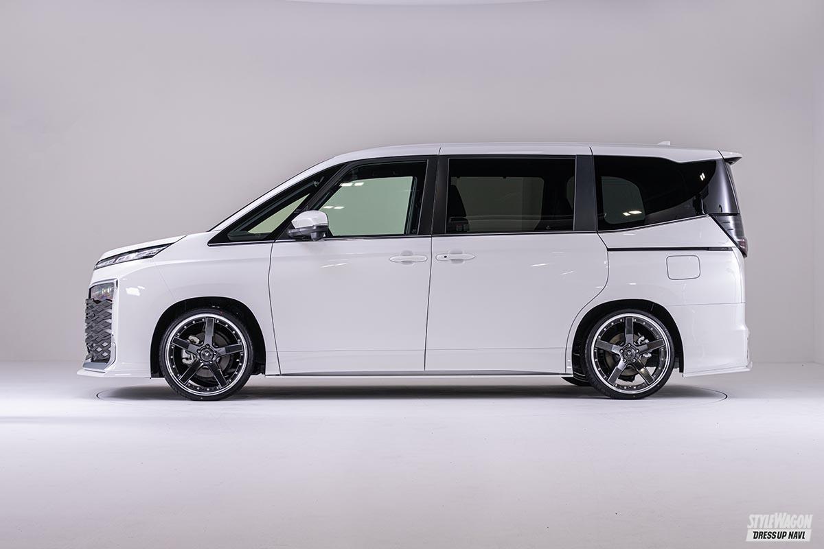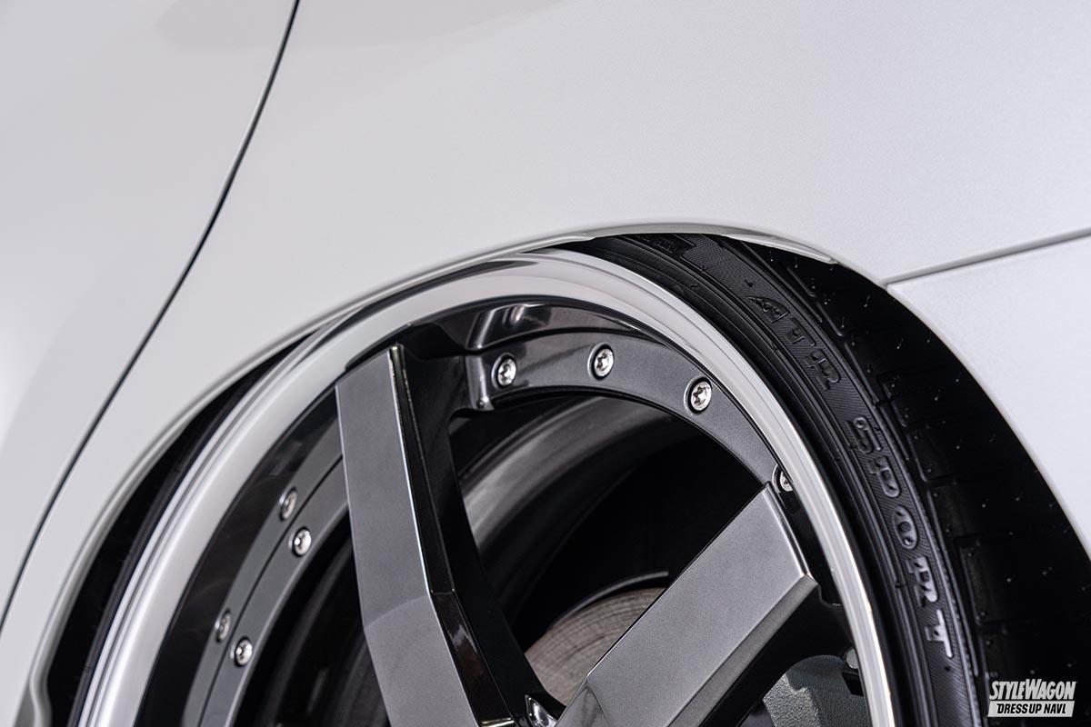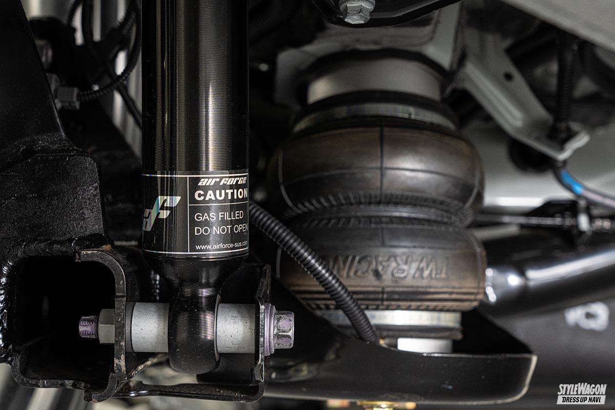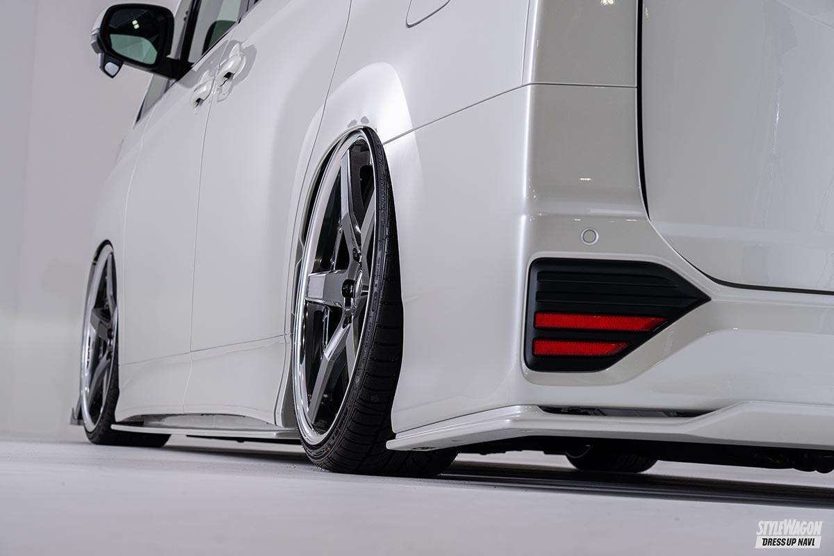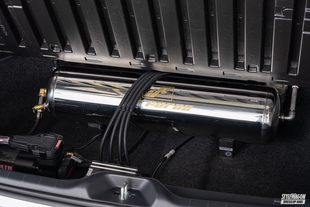 クルーズエアロを装着した2台のデモカーには、エアフォースジャパンのエアサスキットが装着されている。停車時には、地面に設置するかのような低空フォルムを実現。走行時や、段差のあるところでは、ボタンひとつで車高をアップできる便利なエアサスは、ダウンサスや車高調に比べて値段は高いが、相応のメリットがあるので要注目だ。