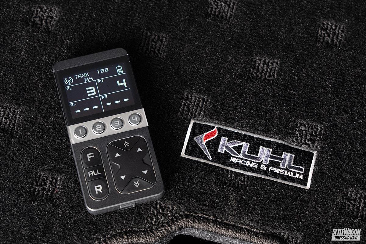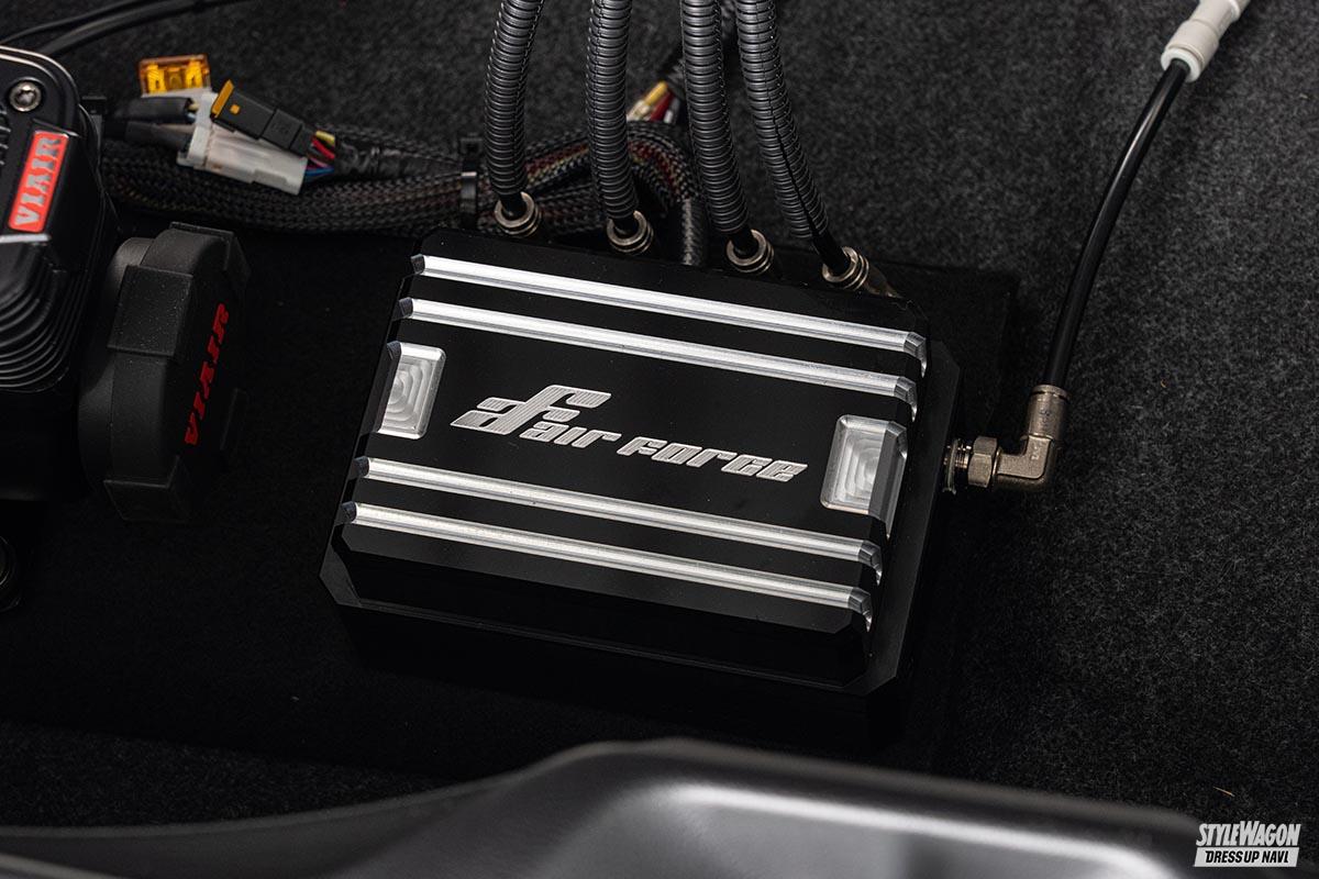 さらに進化を続けるエアフォースジャパンは、エアサスの上げ下げを制御する電磁弁ユニットをバージョンアップ。いままで別体だったECUとバルブを一体化し、プレッシャーセンサーも内蔵。高機能はもちろん、省スペースでの取り付けも実現。より進化したエアサスキットもプログラムのひとつの候補に入れておきたい。