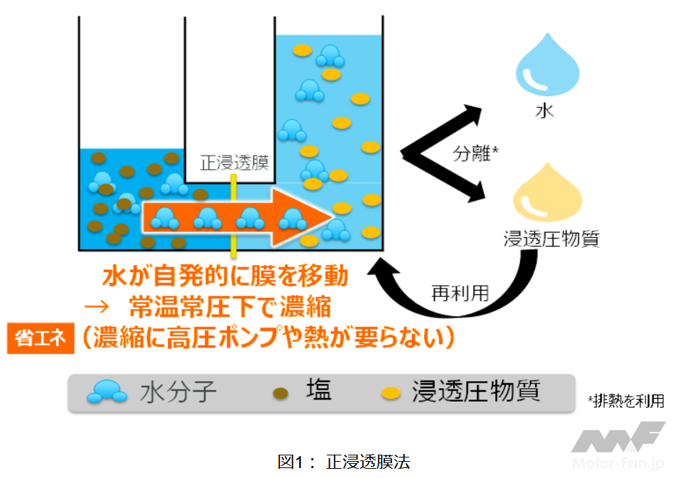 そこで、東芝は、低温・非加圧で濃縮処理が可能な正浸透膜法(図1)に着目した。正浸透膜法は、物質の「濃度が低い水溶液」と「濃度が高い水溶液」を浸透膜で仕切ると、水が濃度の低い水溶液から濃度の高い水溶液へと膜を通過して自然に移動し、濃度を均等に保とうとする現象を利用した濃縮方法である。従来の逆浸透膜法の消費エネルギーが約4kWh/m3であるのに対し、正浸透膜法の消費エネルギーは約1kWh/m3といわれており、消費エネルギーを1/4に削減することができる。東芝はこの正浸透膜法において、濃度の高い水溶液に注入することで水の自発的な移動を促進させる浸透圧物質を独自に開発し、省エネルギーな高濃縮処理と高い水分離性を実現した。開発した浸透圧物質が溶け込んだ水溶液(浸透圧溶液)は、事前に吸収させたCO2を脱離することで水と浸透圧物質が分離するため、浸透圧物質は繰り返し利用することが可能。