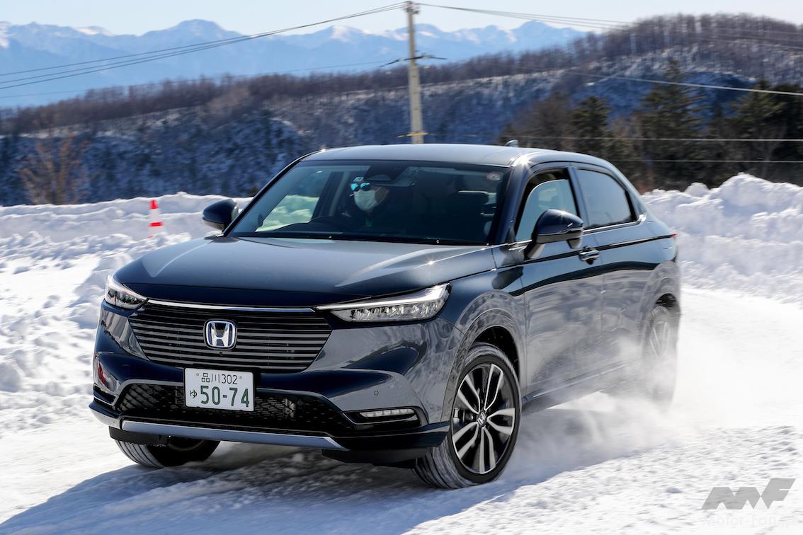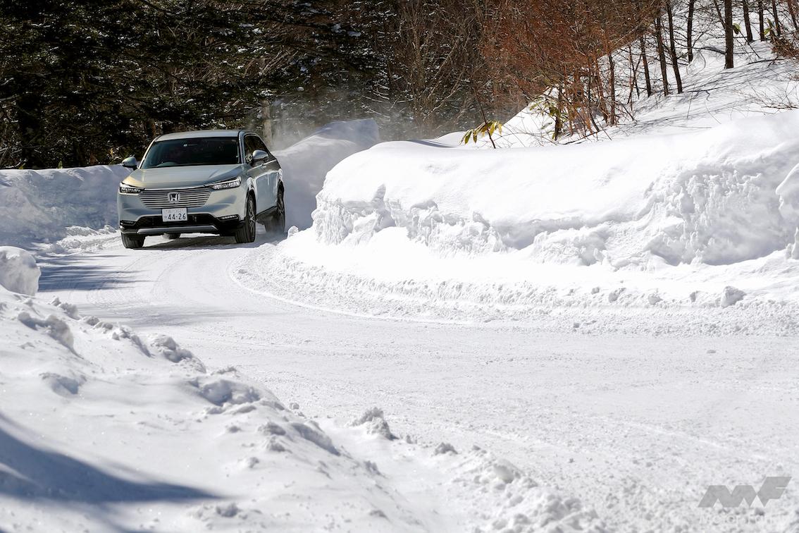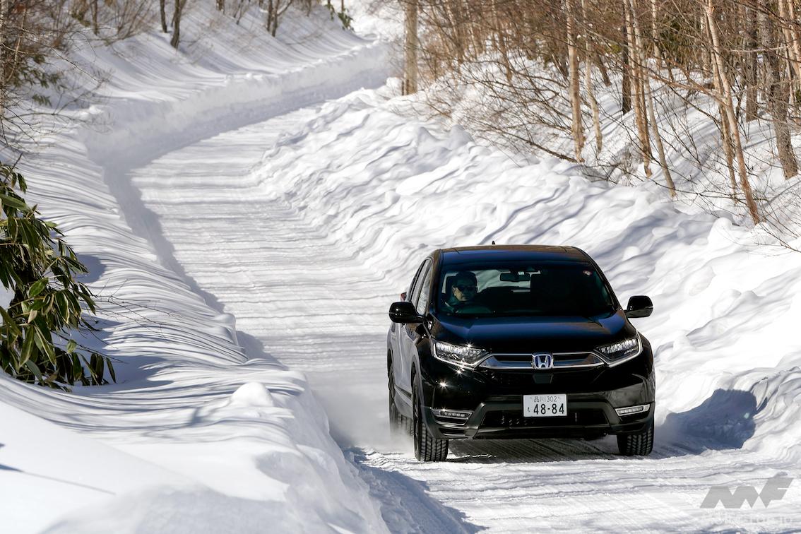 ヴェゼルにしろCR-Vにしろ、リアルタイムAWDを搭載した車両は、過度な緊張感を強いてこなかった。感覚としてはほとんど、ドライ路面を走るときと変わらない。思ったように止まり、曲がり、加速していく。だから、目の前にある道を道幅いっぱいに使って走ることができる。少し走らせれば危なっかしさがないことがわかるので、自然とペースが上がる。思いどおりに動かないクルマではこうはいかない。