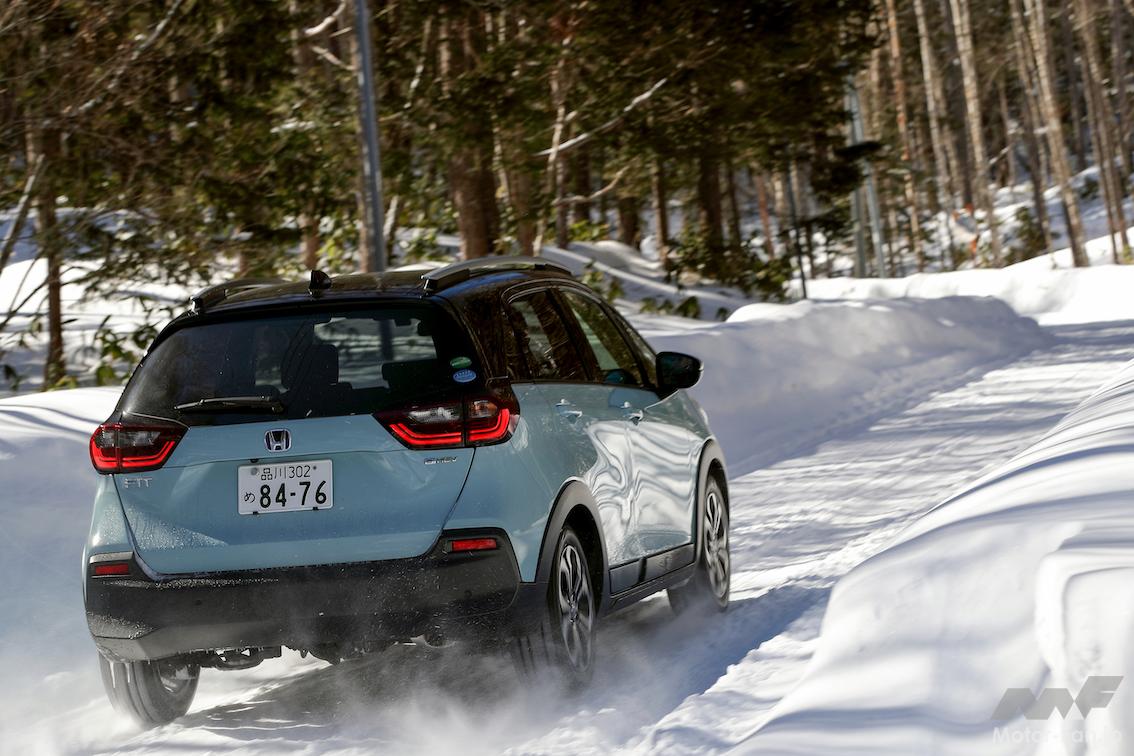 電子制御で能動的にトルク配分を行なうのではなく、受け身(パッシブ)である。前輪がスリップして後輪との差回転が生じて初めて、後輪にトルクが伝わる。30年以上前から低コストで成立する普及版の4WDの位置づけで用いられており、ビスカスカップリングそれ自体に技術的な目新しさはない。ところが、雪上で乗ってみて驚いた。動きがとても滑らかで自然なのである。少し滑ってからグリップを回復し、そのために挙動が変わるといったようなこともなく、ドライ路面で走っているときのようにスムーズだ。なんなら、右〜左にコーナーをクリアしていく動きがとても気持ちいい。