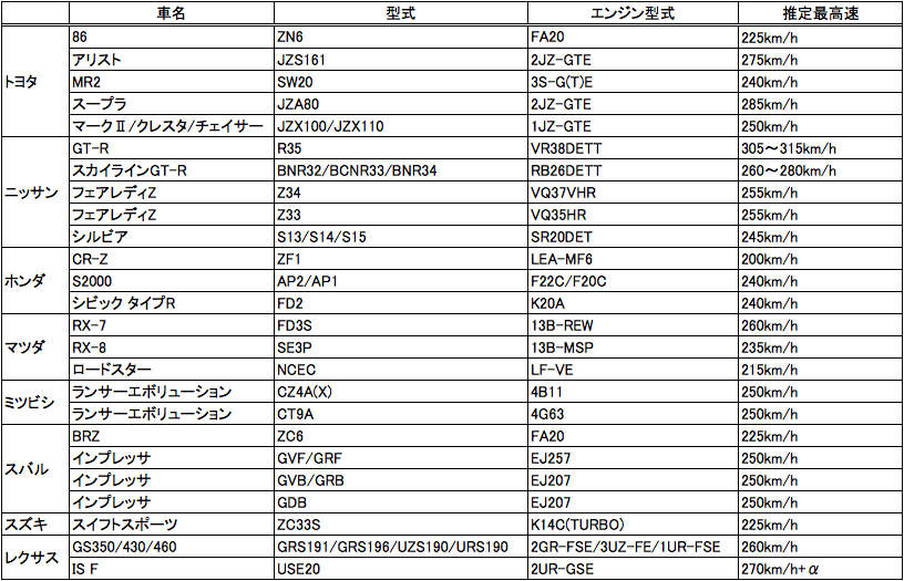 ※このリストは後付けユニットによるリミッター解除を想定しているため、これ以外にもECU書き替えなどでカット可能な車種は多数存在します。