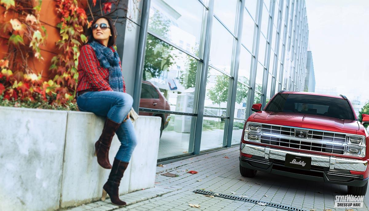 ヘッドライトは縦2灯の4灯タイプとし存在感のある大型グリルをあしらう。メッキバンパーを前後に採用し、テールランプやハッチゲートも一新。ボンネットやフロントフェンダーまで独自デザインとすることで、武骨なアメリカンビンテージへと変貌を遂げている。ホワイトレター入りのタイヤもよく似合う。