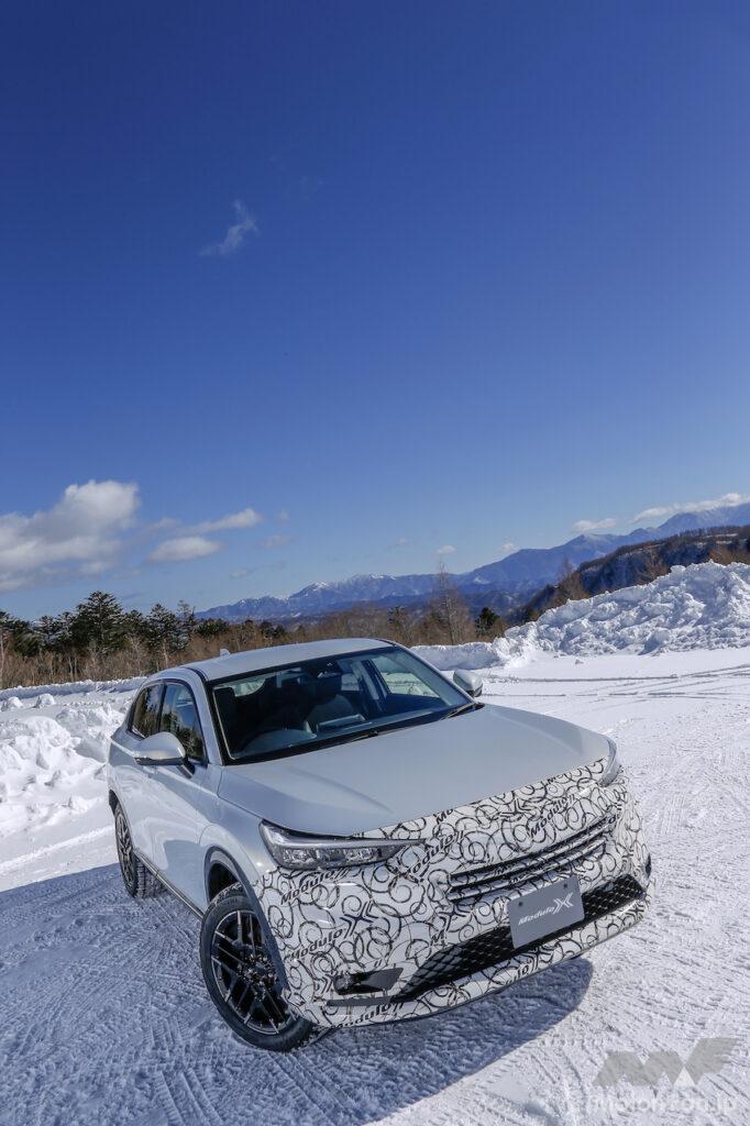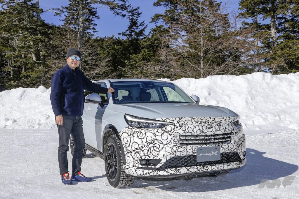 ホンダ純正コンプリートカーのモデューロXは、2013年のN-BOXからスタート。2021年6月には、シリーズ第7弾となるフィットe:HEVモデューロXを発売した。ヴェゼルe:HEVモデューロXコンセプトはシリーズ第8弾で、1月に開催された東京オートサロン2022で初公開。御岳スノーランド(長野県・木曽町)で開催された雪上試乗会には、AWD仕様のプロトタイプが用意されていた。