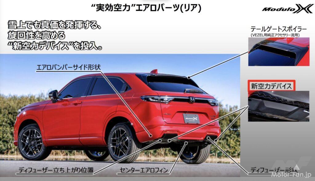このように、ホイールを含めた専用の脚周りと、実効空力のコンセプトで開発した空力アイテムにより、ヴェゼルe:HEVモデューロXコンセプトはモーグル選手のように、路面外乱を吸収しつついなし、澄まし顔で荒れた路面を駆け抜ける。雪上コースではベース車とプロトタイプの乗り比べを行なったが、「本当にダンパーとエアロだけ?」「シャシーに手を入れていない?」と疑問に感じるほど、操舵感の向上ぶりが印象的だった。しなやかさを失わずに、しっかり感だけ増した印象だ。