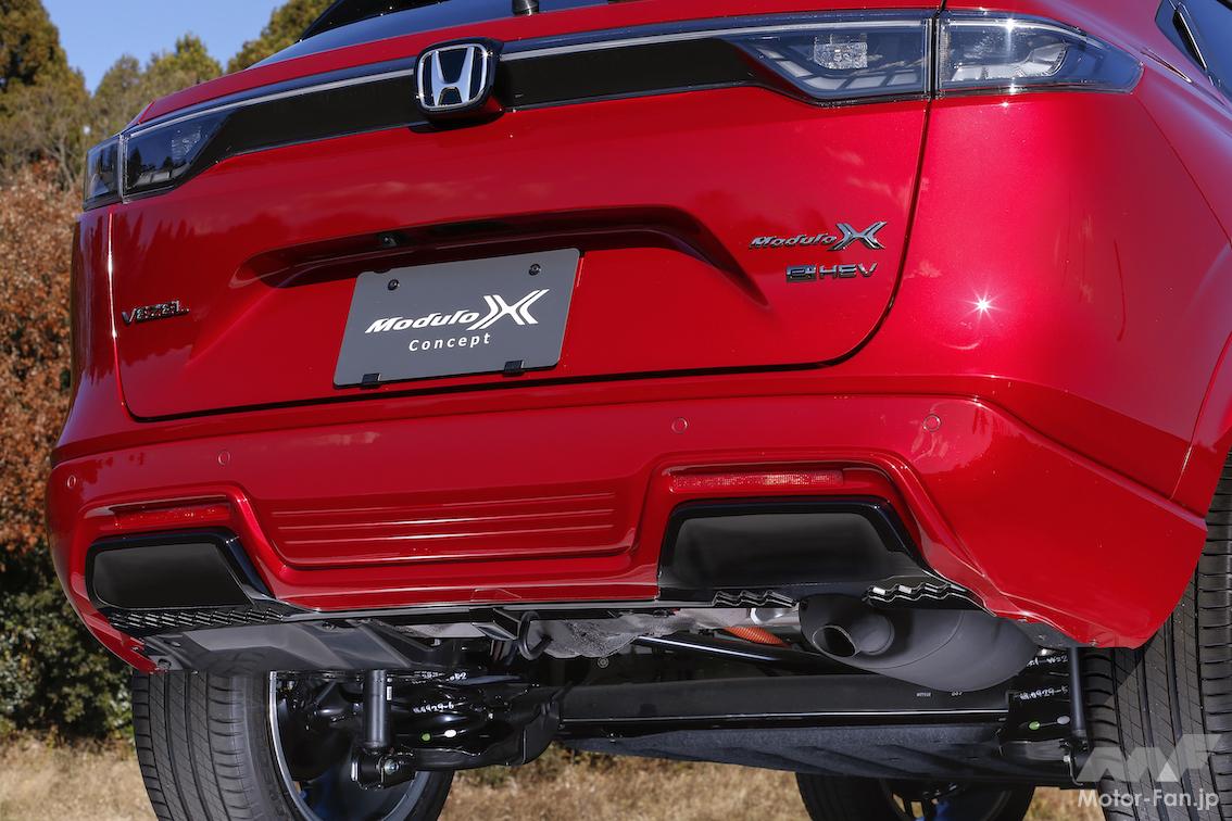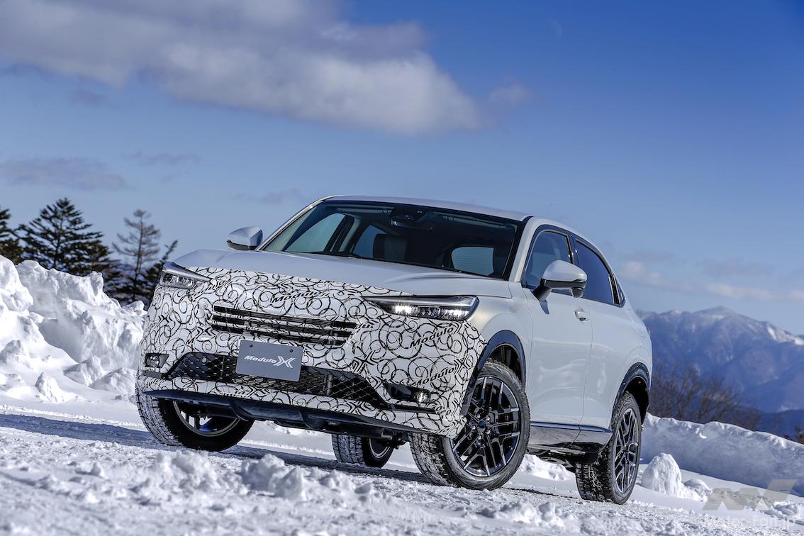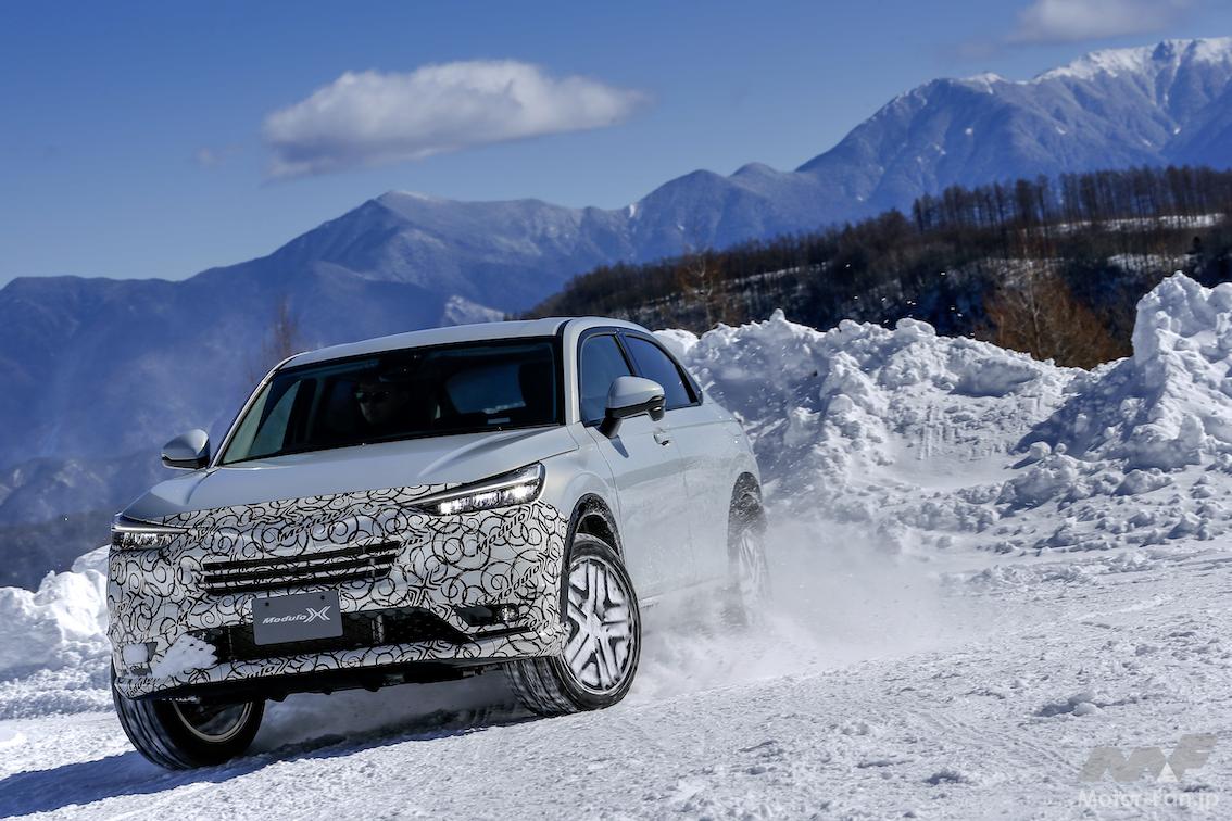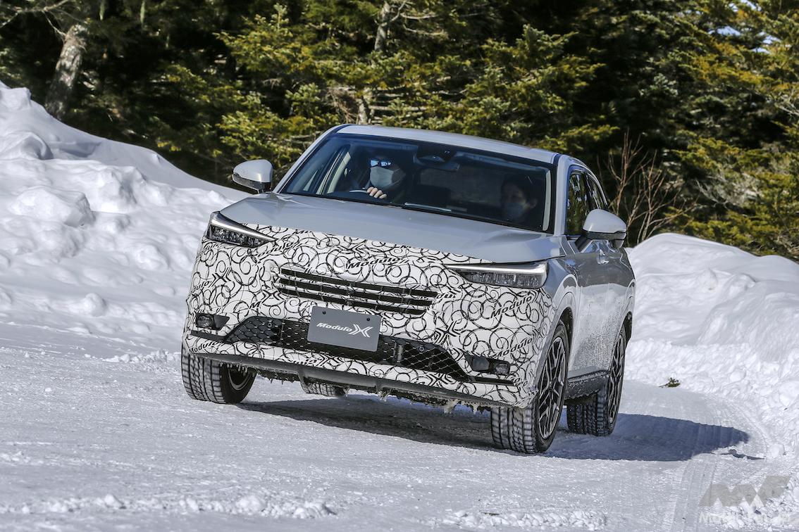 ホンダ純正コンプリートカーのモデューロXは、2013年のN-BOXからスタート。2021年6月には、シリーズ第7弾となるフィットe:HEVモデューロXを発売した。ヴェゼルe:HEVモデューロXコンセプトはシリーズ第8弾で、1月に開催された東京オートサロン2022で初公開。御岳スノーランド(長野県・木曽町)で開催された雪上試乗会には、AWD仕様のプロトタイプが用意されていた。