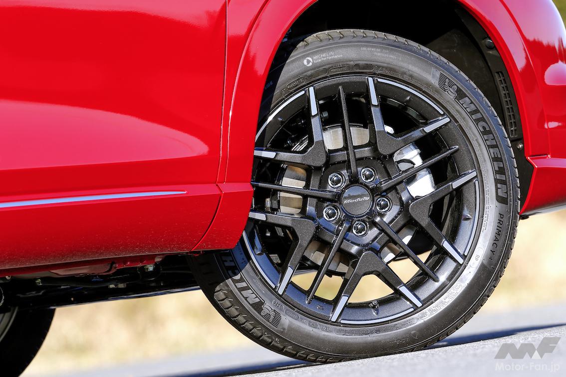 路面への追従性を追求したという専用サスペンションは、ダンパー内部の構造やオイルまでこだわったチューニングを施している。減衰特性は低速域から高速域までリニアとし、硬い、柔らかいではなく、質にこだわった点を強調する。専用ホイールは「ホイールもサスペンションの一部」という設計思想で開発。剛性の向上のみを追求するのではなく、適度にたわませることで路面への追従性を高める考えだ。