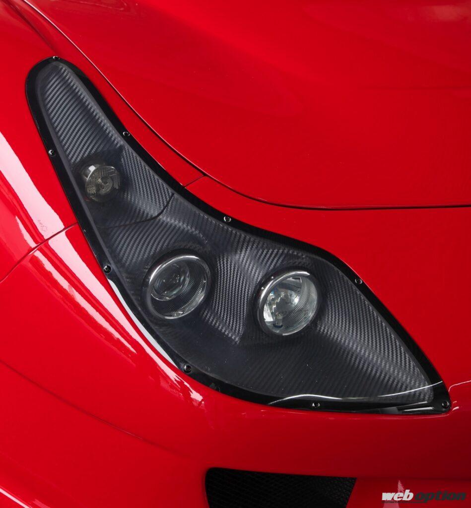 ローフォルムを演出するために落とし込まれたノーズデザイン。フェンダーと一体で構築された固定式ヘッドライトは独創性の塊だ。