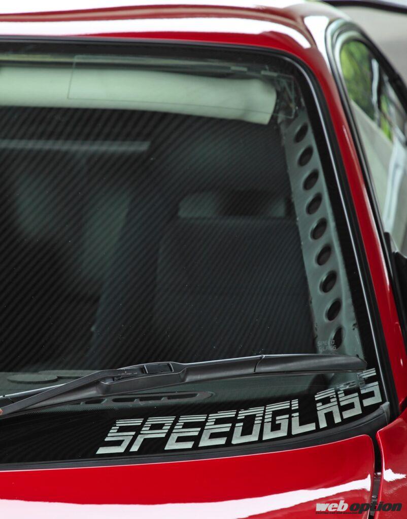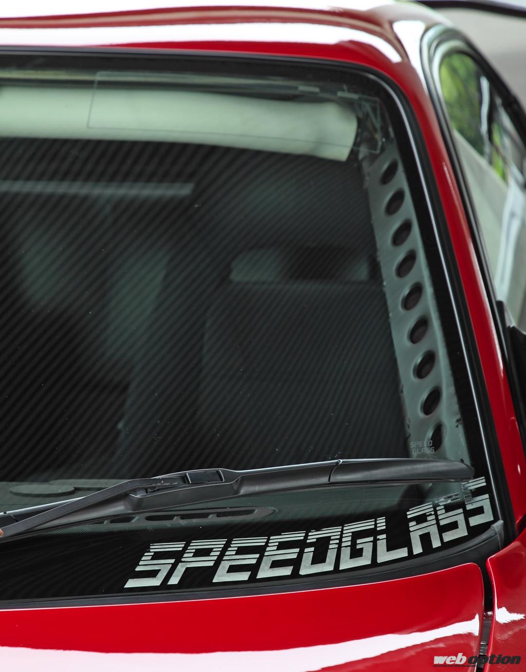 ロールケージは溶接留めに加え、ピラーなどにガゼットで固定されボディ剛性を大幅にアップ。軽量化に向けてフロントウインドウにはスピードグラスが採用された。単なるドレスアップ仕様とは作りが根本から異なるのだ。