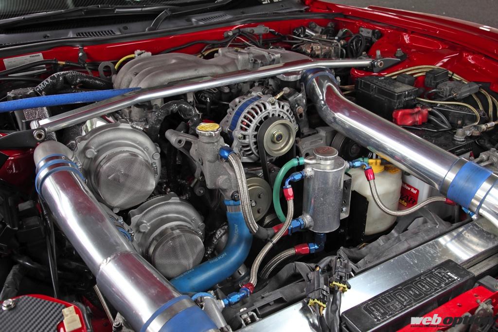エンジン内部はフジタエンジニアリング謹製のサイドポート拡大(バージョン5)で、ツインターボとのマッチングを取る。純正タービンですら起こり得るサージングも皆無に等しく、低速域からレスポンス良くブーストが立ち上がる特性に仕上がっているそうだ。