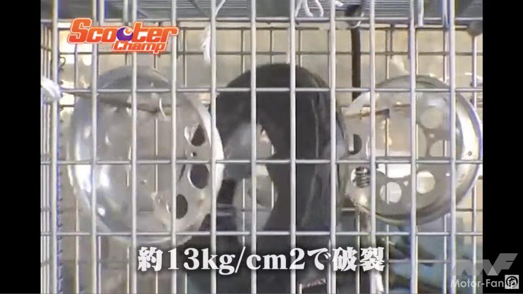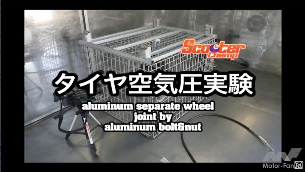 エアを入れ続けて爆発するまでの工程はスチールホイール&チューブレスタイヤと同じように、早送りとスローモーションで紹介されている。合わせホイールとチューブタイヤでも実験の様子は固唾を飲むもので、破裂する瞬間は衝撃的。新品のボルト&ナットを規定トルクで締め付けたにも関わらず、タイヤ内のチューブが破裂した勢いでボルト&ナットは吹き飛び合わせホイールが分解してしまっているのだ。どれだけの衝撃なのか誰でも想像できることだろう。
