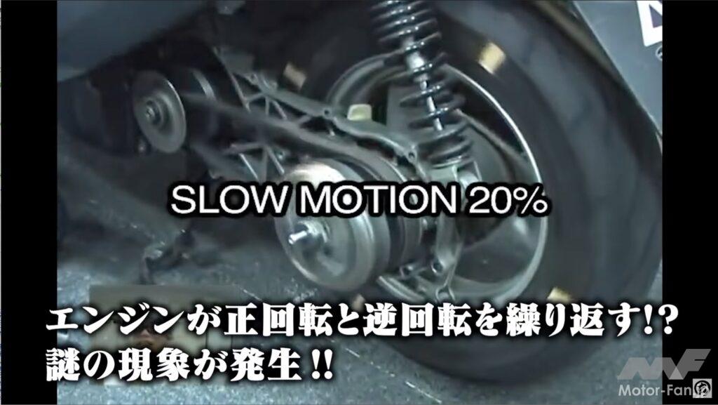 続いての実験はスクーターのエンジンが逆回転するのかどうかを試している。スクーターの駆動系は最も手軽にチューニングできるため、ショップに頼らずユーザー自ら行うことも多い。当然ミスが起こり得るわけで、それをあえて試してみようというわけだ。今回はまわり止めのキーを取り外してアウターローターの位置を調整、ピックアップコイルの配線を差し替えて行った。当然セルは使えないため、インパクトドライバーを逆回転させてスターター代わりにしている。