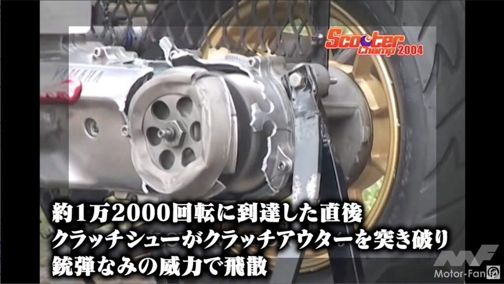 最後のテストは駆動系が爆発するのかどうかだ。チューニングされることが多いスクーター。チューニングされていればエンジンは純正で設定されていた以上の回転数まで回り続けてしまう。高回転でのパワーと排気音が魅力なわけだが、空ぶかしを続けていたらエンジンを壊してしまったなんて経験がないだろうか。今回はあえて駆動系はノーマルのまま、エンジンの吸排気系を変更して高回転まで回り続けるようにしたエンジンを用意して実験している。