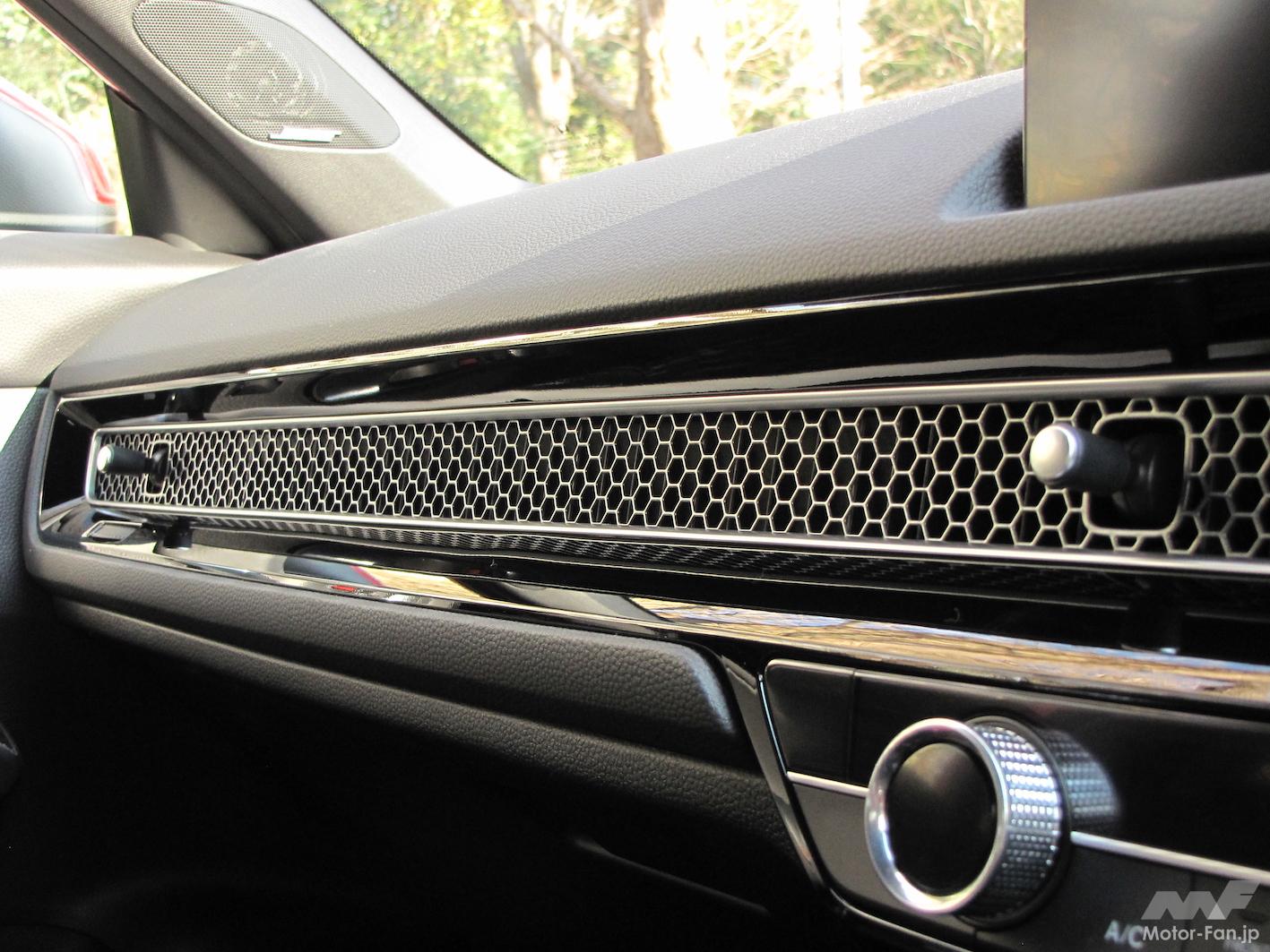 面白いと思ったのはエアコンの吹き出し口で、インパネ中央から助手先側の端までパンチングメタルの細長いルーバーで覆われ、その一部が空調のアウトレットとなっているのだ。見た目にはパンチングメタルで覆われているだけで吹き出し口はわからず、吹き出し方向を操作するためのノブによってなんとなく場所が把握できるといった具合だ。これは格好いい。スポーティネスの新しい表現方法と言ってもいいだろう。