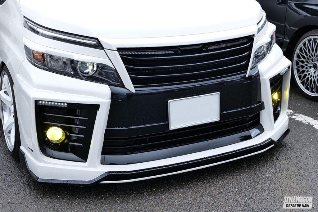 「この組み合わせは見たことがないので自慢です」というフロントマスクは、エムズのフロントスポイラーとロジャムのグリルによるもの。ワイド感があってスポーティな仕上がりのフェイスは迫力たっぷり。テイン車高調にF3度/R5度のキャンバーを付けた足まわりは「ちゃんと走れるシャコタン」となっている。