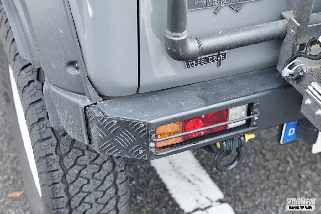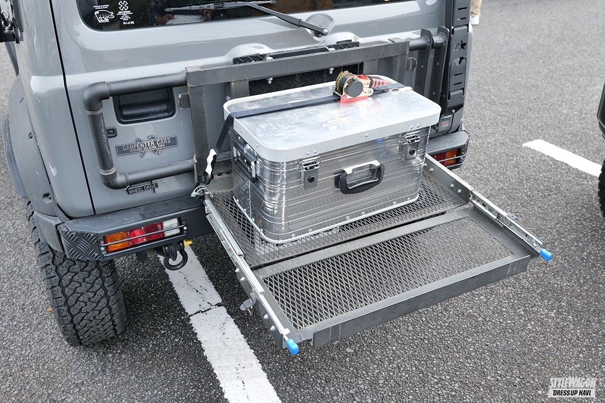 前後のバンパーやフェンダーなども目を惹くが、JA11用のルーフラックをワンオフ加工して取り付けたり、リアキャリアを自作するなどのDIYもお見事。特にリアキャリアはガス管をカットして溶接し、チッピング塗装で仕上げられていて、しかもスライドして積載容量を増やせる構造にもなっている。