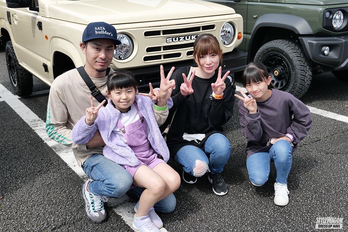カスタムのキッカケは? の問いに「JA11に乗っていて奥さんにもジムニーを好きになってもらいたくて」と答えてくれた岩間さんは、ミーティングにも家族で参加。自慢のポイントはダムドのバンパーをカットして取り付けたK2オリジナルマフラー。他にも自作の内装ウッドパネルも完成度が高かったです。