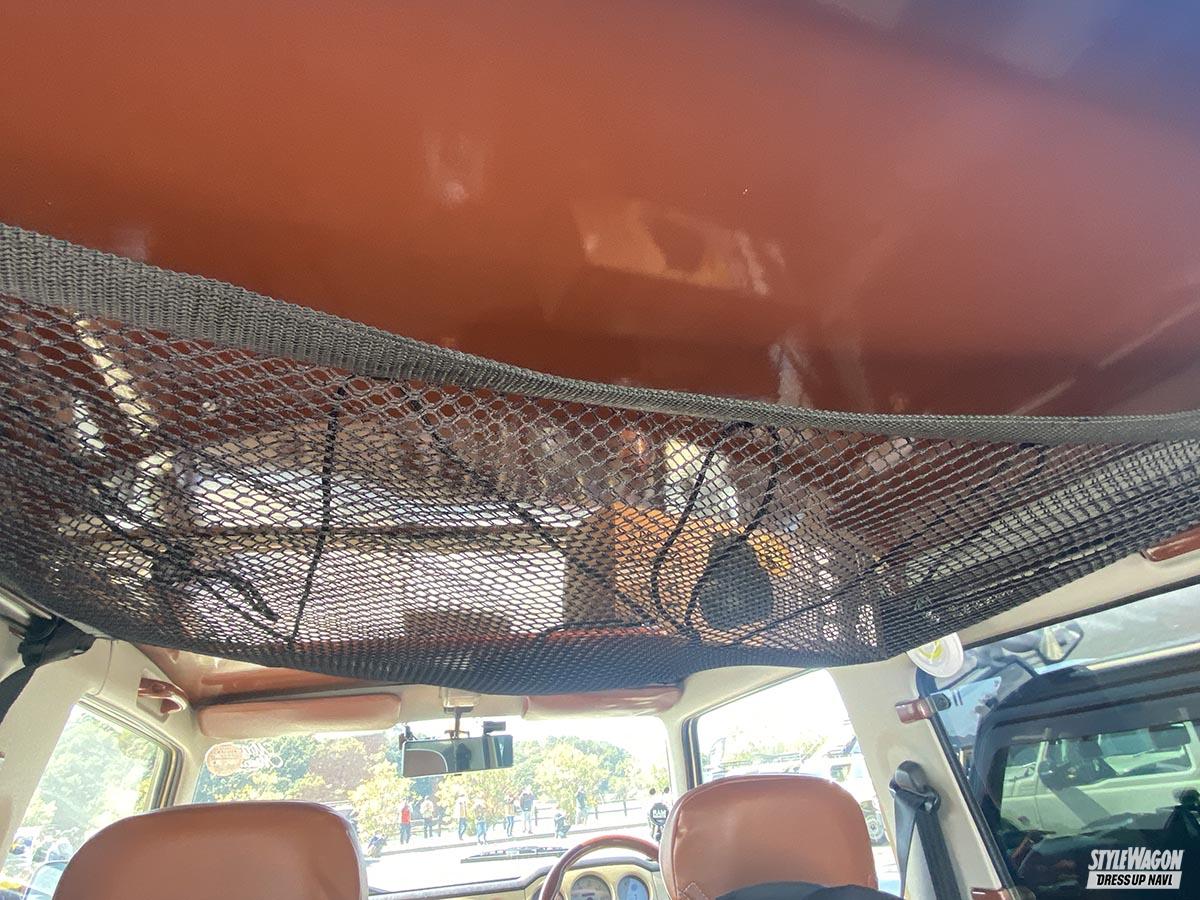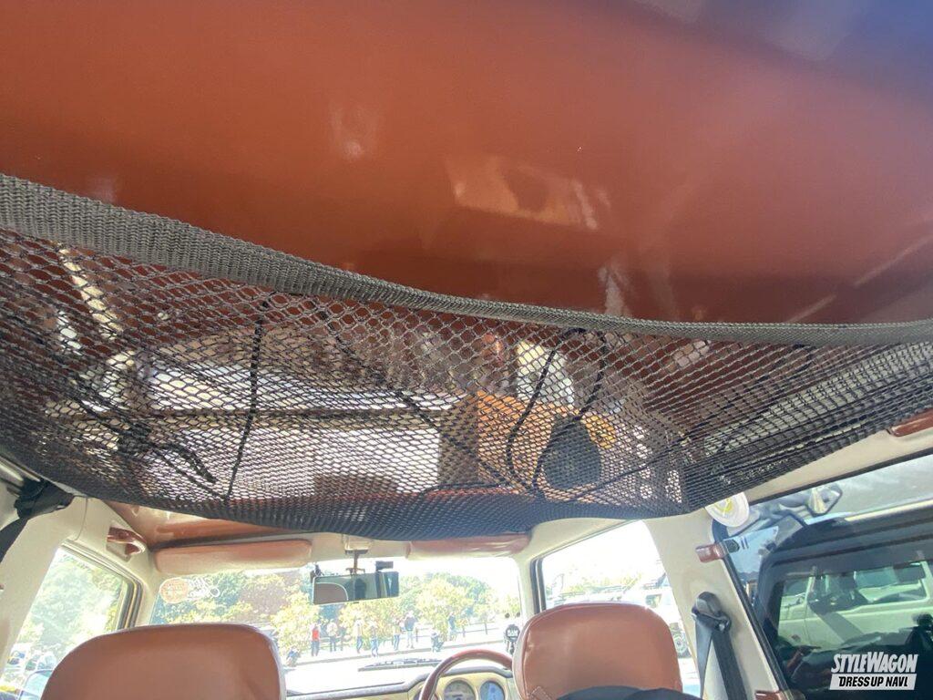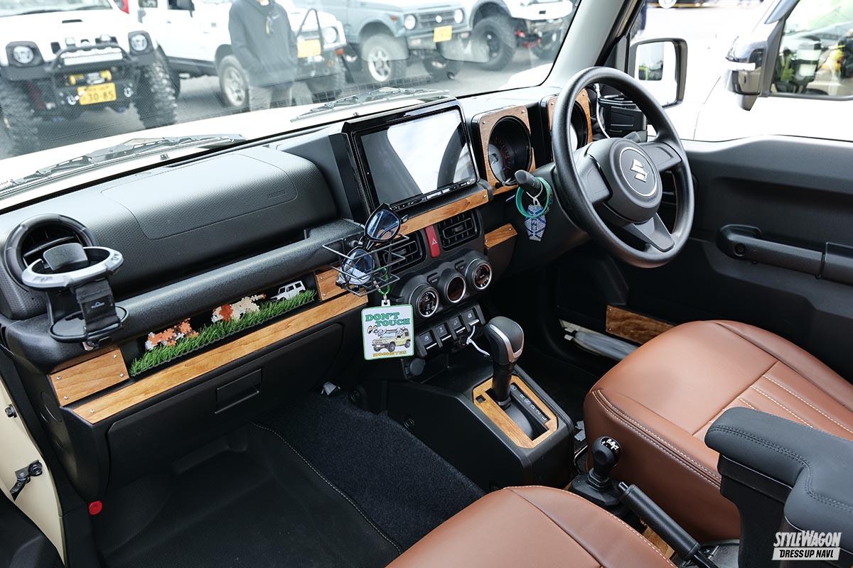 リアテーブルと内装の全塗装がご自慢のポイントである田中さんのJA22。見た目のワイルドさとは違いインテリアはお洒落なイメージ。ボディのサンドベージュとマッチするブラウン系のカラーで車内を統一。天井までオールペンされている。このジムニーで車内カフェやデイキャンプを楽しんでいるそうだ。