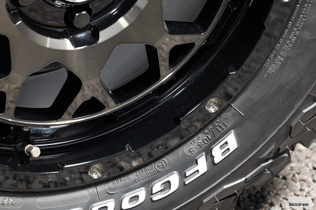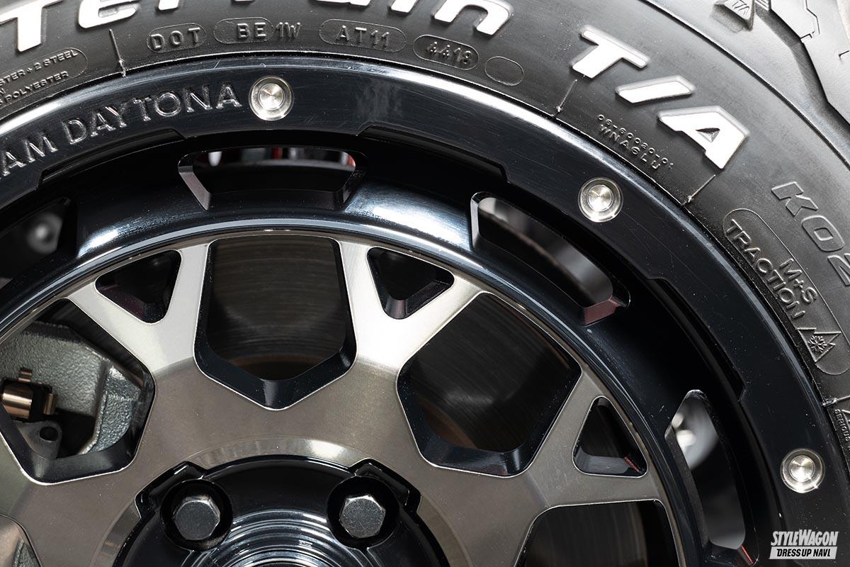 チームデイトナといえば“パーツ感”にこだわっているのも特徴だが、このM9でもビードロックテイストのリムフランジや、そこにドリルド加工されたピアスボルトのデザイン処理によって大口径感とタフネスさをアピール。ナットホール周辺もナットの掛かるフチ部分を敢えて凹ませるなど、そのギミックも実に巧みで多彩だ。
