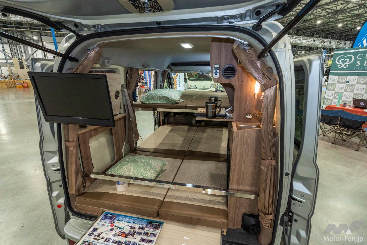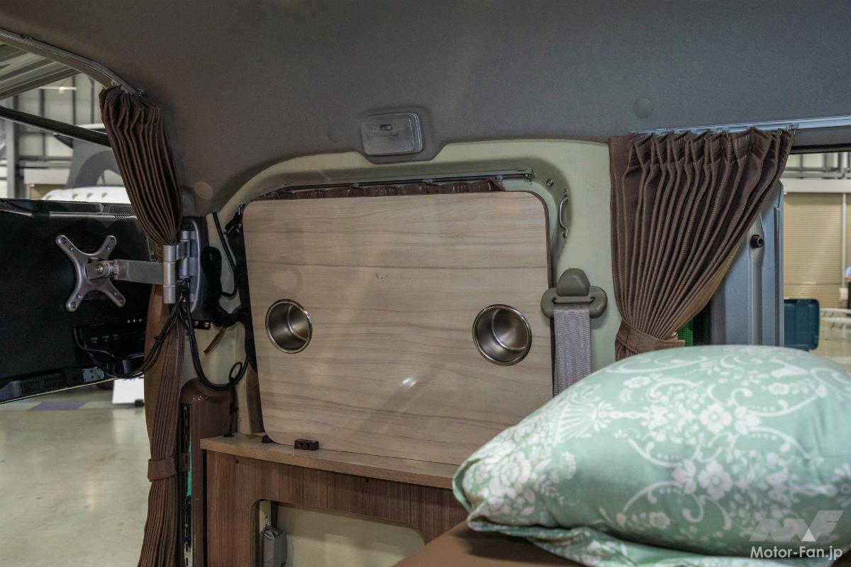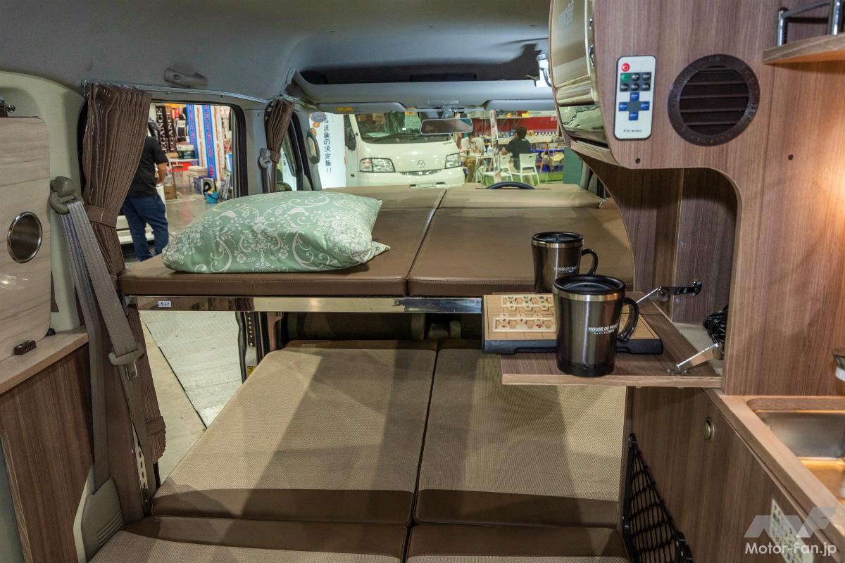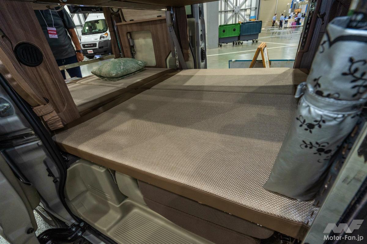 まず車内後方には、お約束のキャビネット。テーブルやシンクを装備している。そしてシートをフラットしてベッドマットを展開することで、L1850×W1000〜1200mmの就寝スペースに。さらに運転席&助手席上にオプションのフレームとマットを使うことで、L1900×W1200mmの上段ベッドに。上段ベッドは助手席の上だけ展開することも可能なので、ひとり旅のユーザーは寝食分離の生活をすることも可能だ。