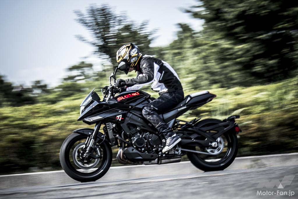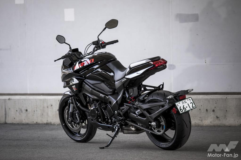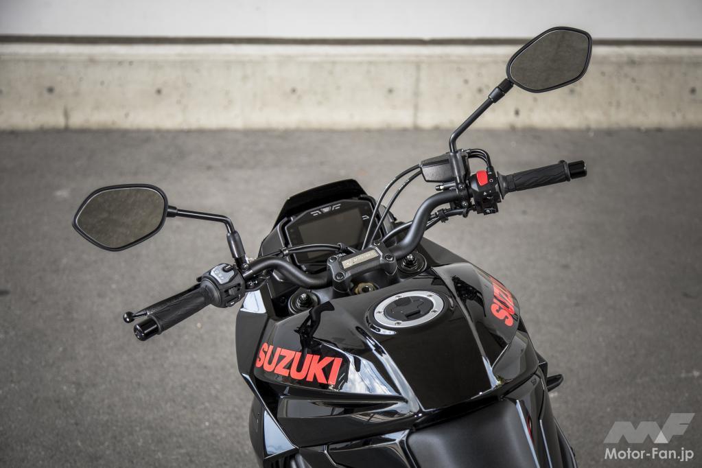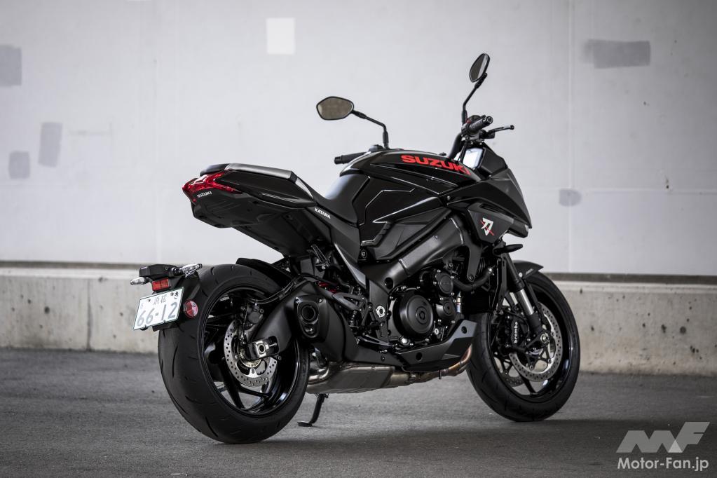 カタナといえばシルバーですが、ブラックもとても似合うじゃないですか!! 新型「カタナ」では両方が選べ、ブラックの実車を目の当たりにすると、タンクにある赤い“SUZUKI”ロゴも黒との好相性を見せて、黒も欲しくなります。