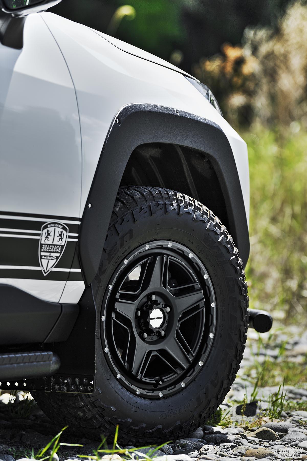 直線基調でありながら、要所にゆるやかなアールを織り交ぜたRAV4の洗練されたシルエットには、ただ単にシャープなだけのホイールよりも、最新のデザインワークを感じさせる魅せヂカラの強いモデルがよく似合う。例えばオフ系ブランド、ウェッズアドベンチャーから発信されるこのマッドヴァンス07。鉄板の5スポークだが、そこへひと味の個性を振りかけた、ワイルドかつスタイリッシュな独創的ビジュアルが最大の魅力だ。