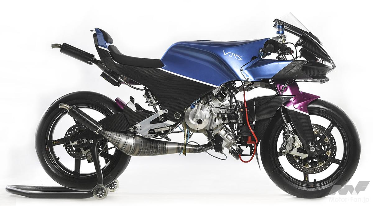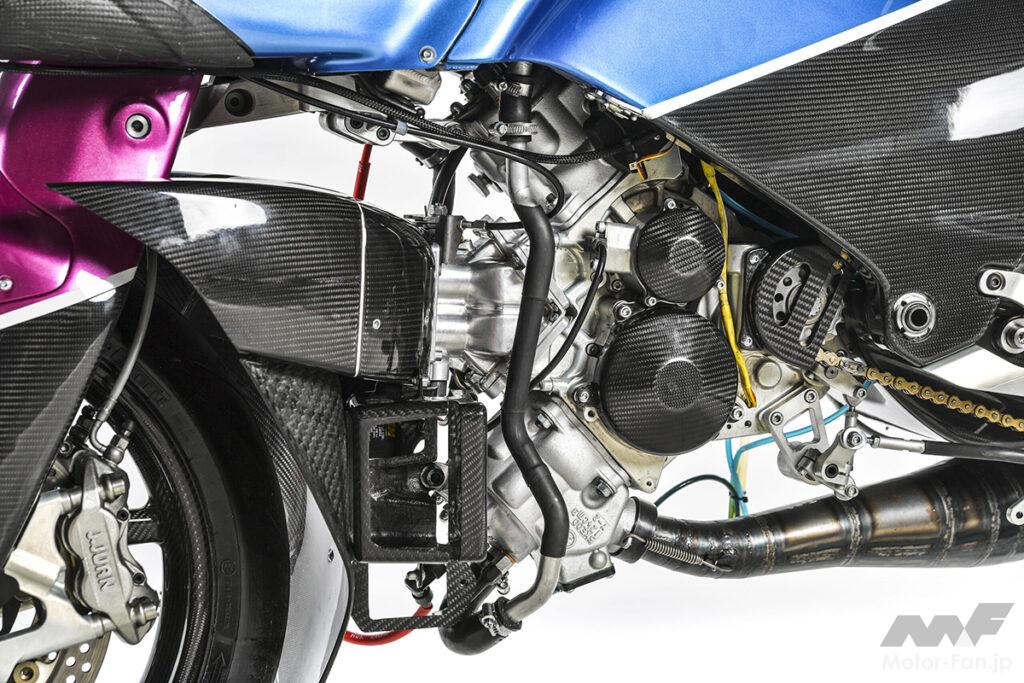レース仕様&ストリート仕様ともに75hp(75ps)/45Nmを発揮する水冷2ストロークVツイン249.5ccエンジン。単体重量はわずか28kg