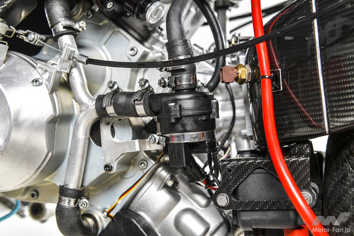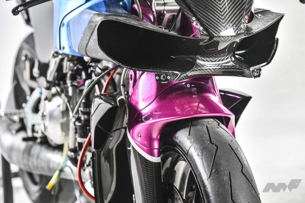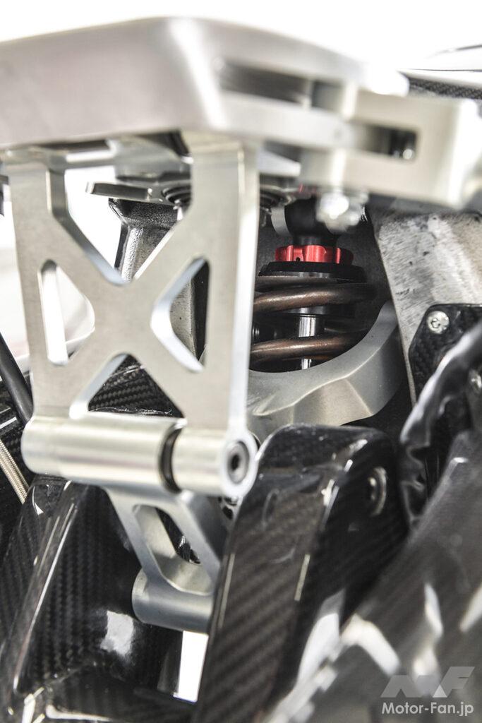 完全自社製造のフレームは、空力特性も徹底的に研究され、前面投影面積を極小に抑制。ダミータンク内にラジエーターを配する独特のレイアウトながらも、十分な吸気と冷却が行える構造としている。