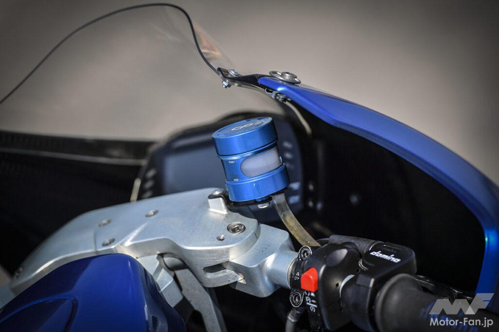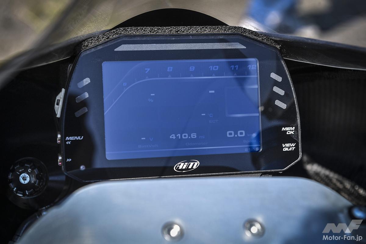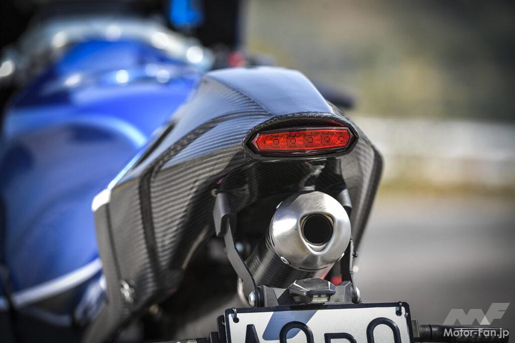 燃料タンクなど、ボディワークの随所にカーボン素材を多用して軽量化を推進。公道走行可能な保安部品をすべて装着した状態での車両重量は、120㎏まで抑制された。