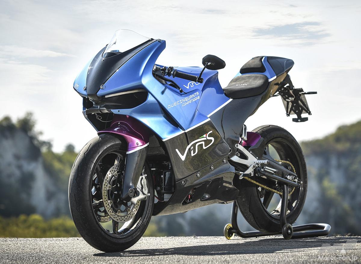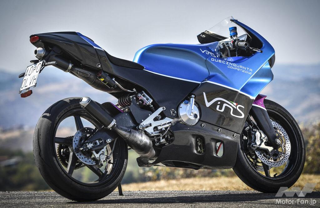 上記の2ストロークエンジンの開発・製造元であるイタリアのVins Srl社は、2017年に設立。ストリート仕様のドゥエチンクアンタ ストラーダ(990万円/公道走行用)と、ドゥエチンクアンタ コンペティツィオーネ(750万円/競技専用)は、MotoGPマシンを彷彿させる超贅沢で超高性能なフルカーボンの超軽量・超高剛性を実現したモノコック構造シャシーに、75馬力を発揮する、重さ28kgの水冷2ストV型249.5ccエンジンを搭載。