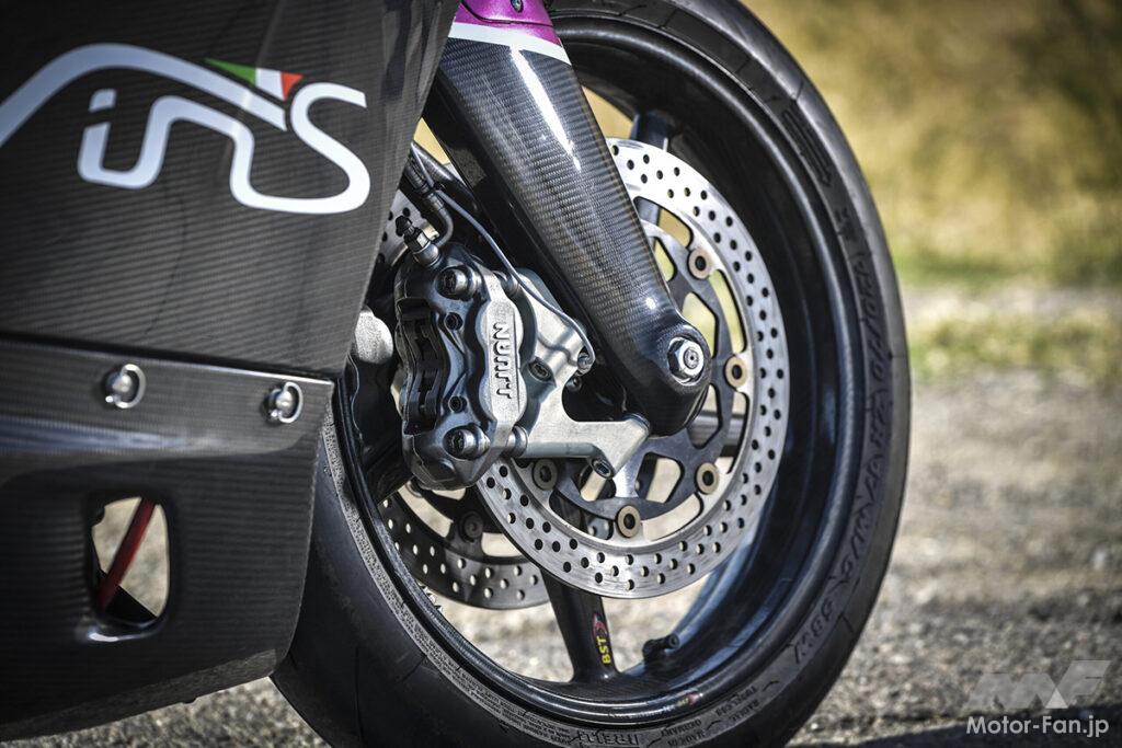 フロントフォークはカーボン製のダブルウィッシュボーン構造を採用。リアスイングアームに加え、前後ホイールにもカーボンを導入済み。レース仕様であるコンペティツィオーネの車両総重量は、わずか102kg。なお、保安部品等を装備した公道走行可能なストリート仕様であるストラーダの重量は105kg。