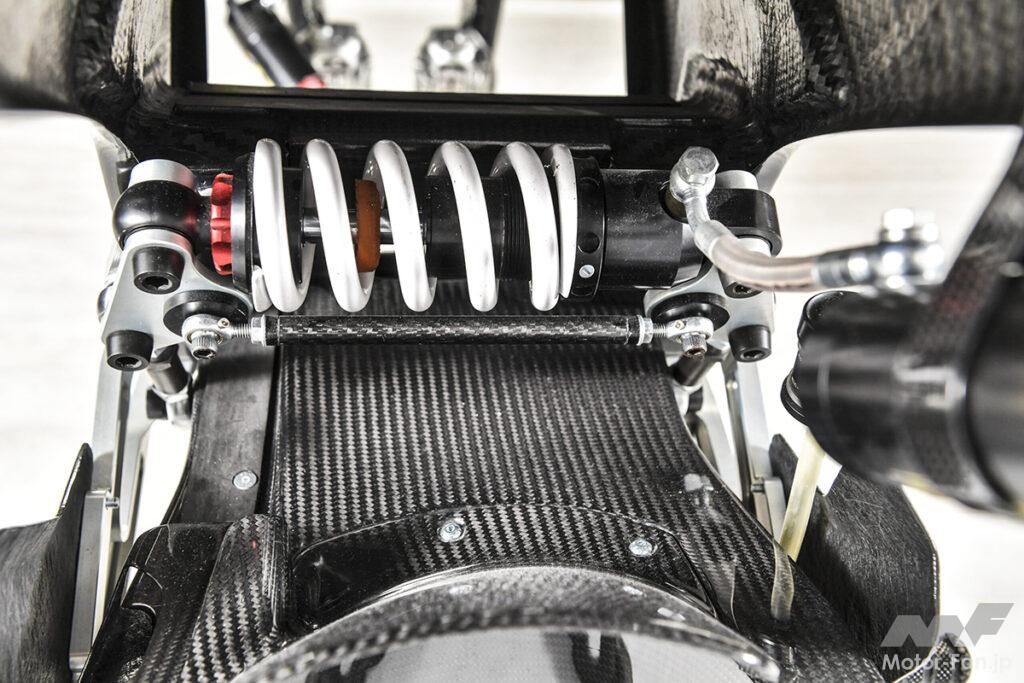リアサスペンションプッシュロッド式並行配置モノショック、カーボンファイバー製リアスイングアーム