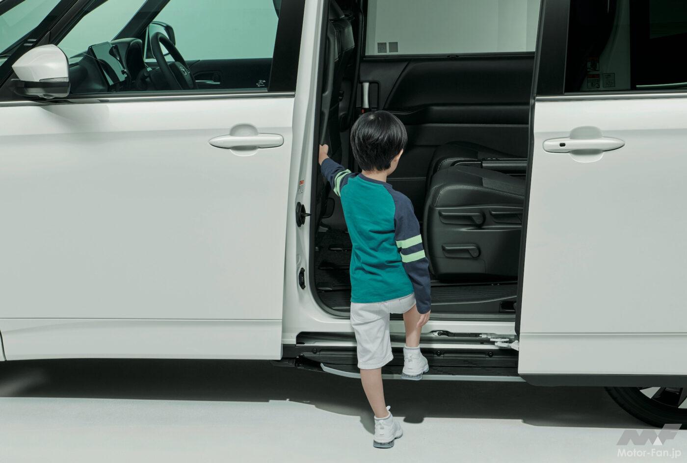 身体をひねったりすること無くそのまま乗り降りできるのがスライドドアの良いところ。しかし、まだ身体が小さい子どもや足腰が弱くなった高齢者にはステップ高さがネックになることも。それを助けてくれるのが、元からあるステップより低い位置にせり出す追加ステップだ。