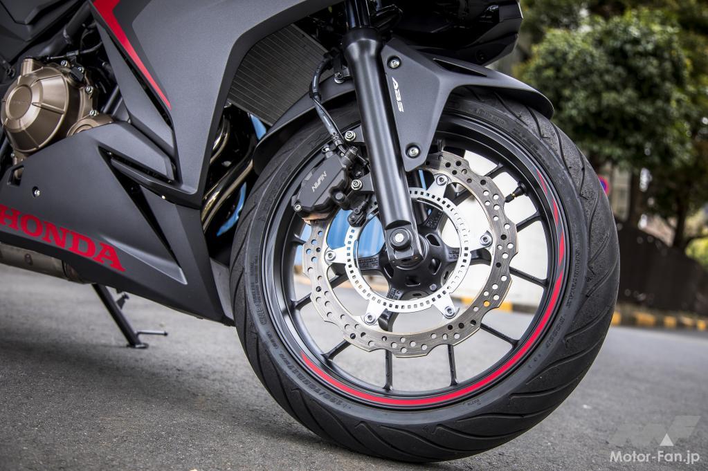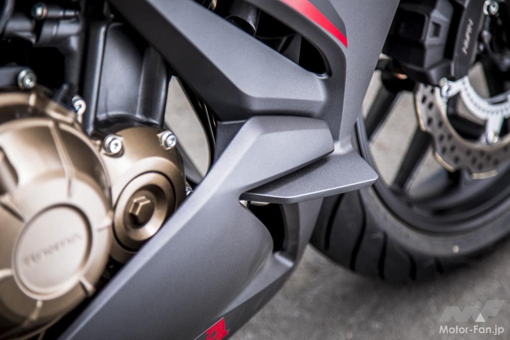 基本的に400Xと共通の270度クランクを持つ水冷ツインエンジンには噴霧の狭角化と噴霧粒径の最適化で吸気バルブに集中して燃焼ガス供給を担う新型インジェクターを採用。 従来モデル比で全回転域に渡るパワー・トルクアップを実現している。