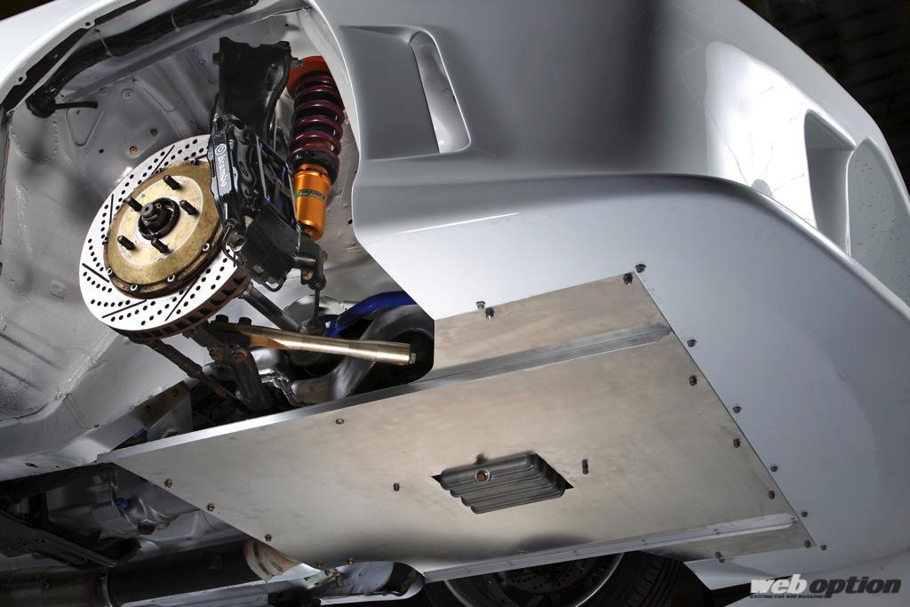 ボディやサスメンバーの応力集中箇所には補強が施され、サスは高速周回路用にセッティングされたアラゴスタダンパーとメルヴェレーシングスプリング(F14kg/mm R10kg/mm)をセット。アーム&ブッシュ類はノーマルだ。また、空力を味方につけるべくフロントバンパーは専用開発し、アンダーパネルも設置。