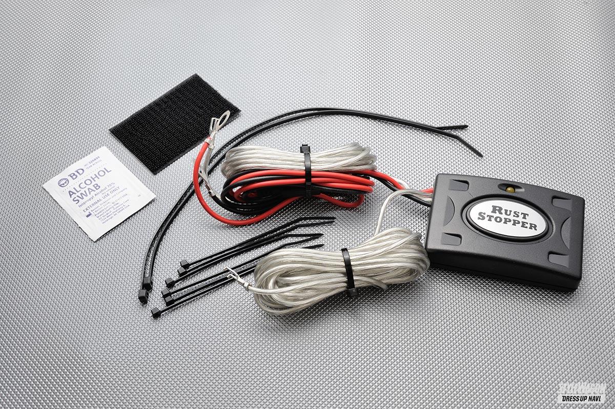 3本(機種により4本)の配線を接続するだけの簡単さが特徴で、電気による防食作用によりサビ抑制の効果が得られる。簡単に仕組みを説明すると、ラストストッパーを介しボディへ微弱な電子を流すことで得られる化学作用がその正体。潮風が含む塩分や梅雨・台風の湿気など走行以外の要因でもサビていくので、愛車を長く乗っていきたいと思うなら、ラストストッパーは見逃せないアイテムなのだ。