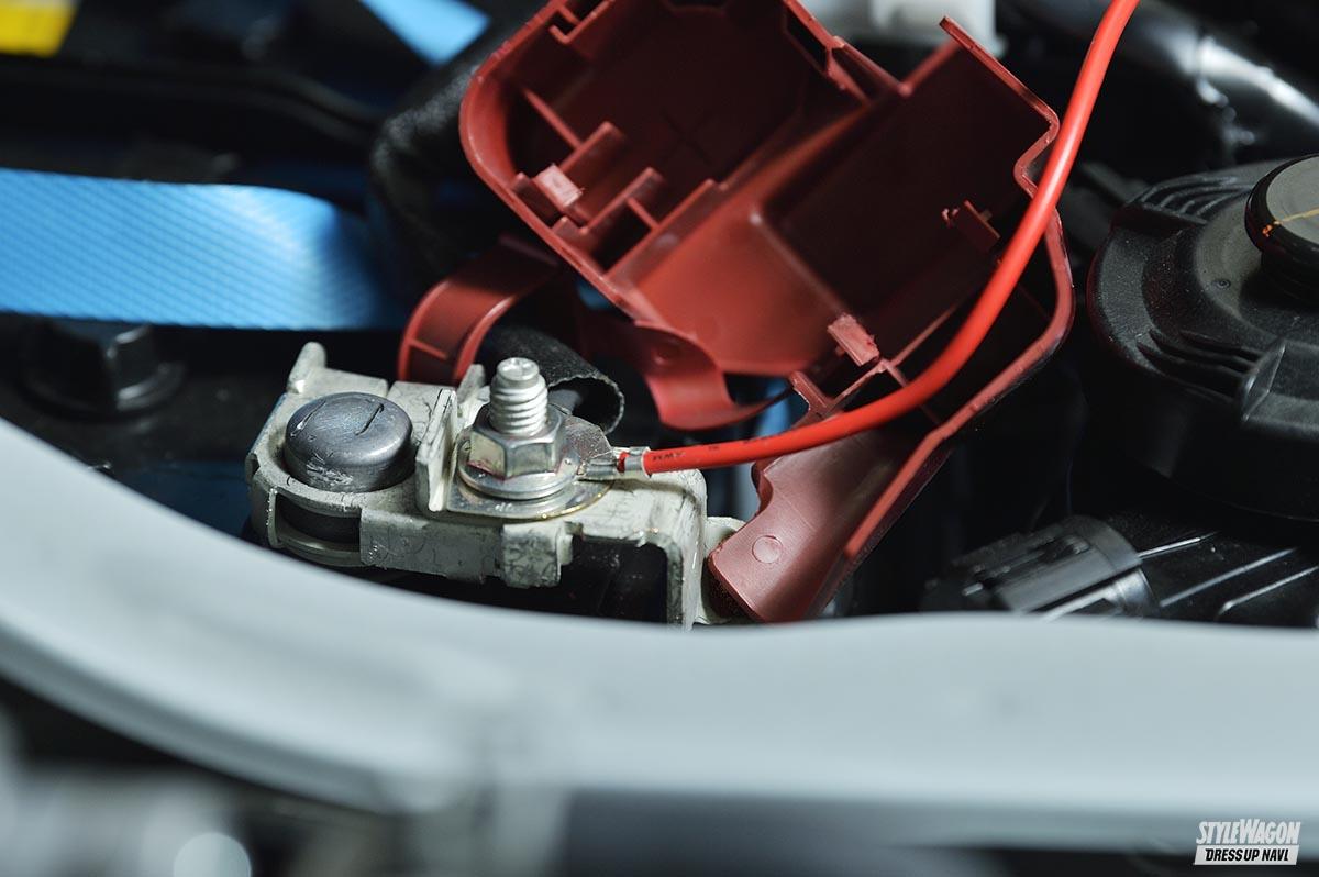 作業は必ずエンジンスイッチをオフにしてから行う。バッテリー等に繋がるボルトを緩めていく。最初に赤いコードをバッテリーのプラス端子に。黒いコードをマイナス端子へと接続。クリアのコードはボディの塗装面にあるボルトと共締め。配線を取り付ける際、配線→ワッシャー→ボルトの順番を守ろう。最後に熱がこもりにくい箇所へ設置。本体背面にマジックテープがついているから、室内のカーペットに貼り付けることも可能。