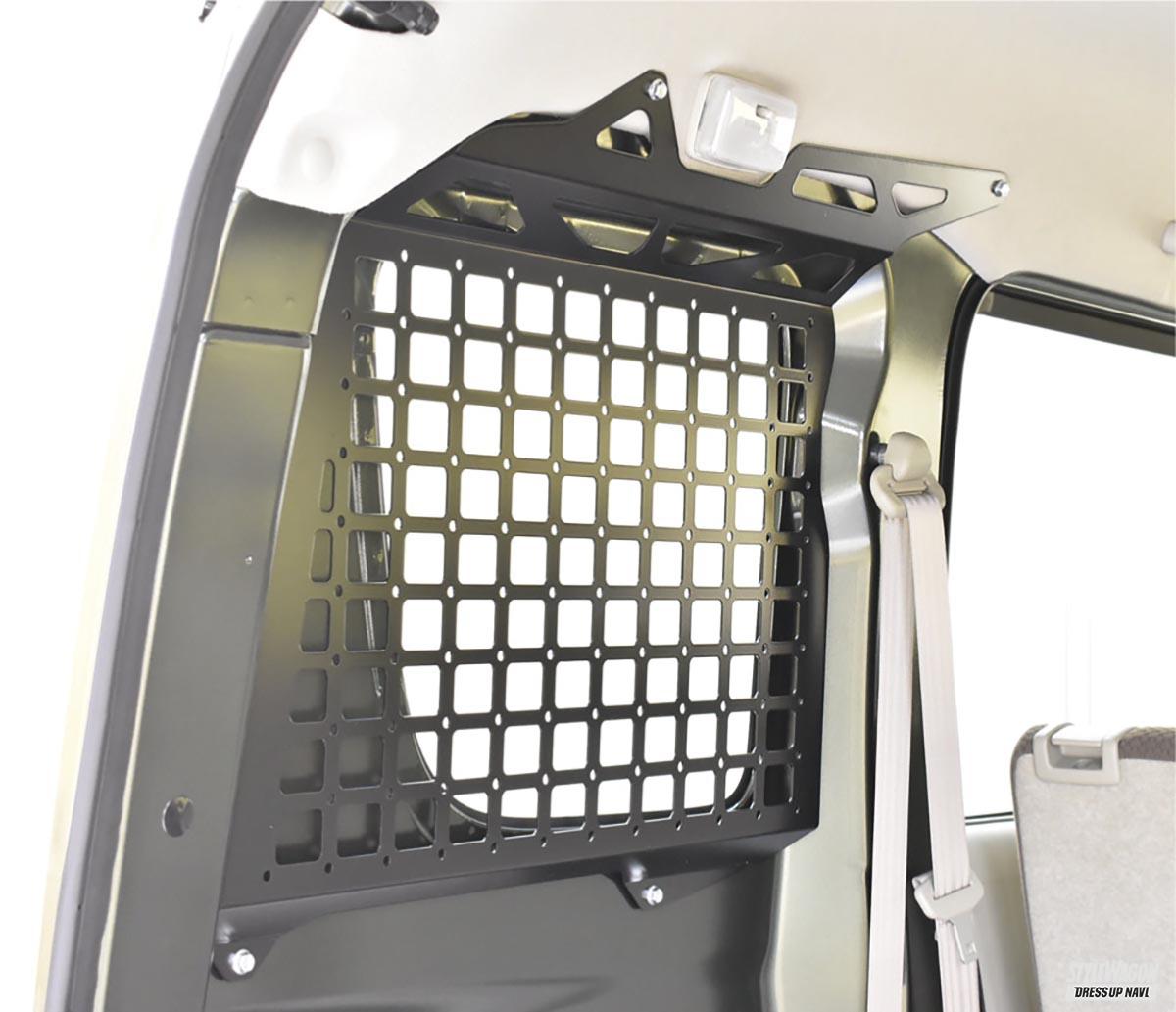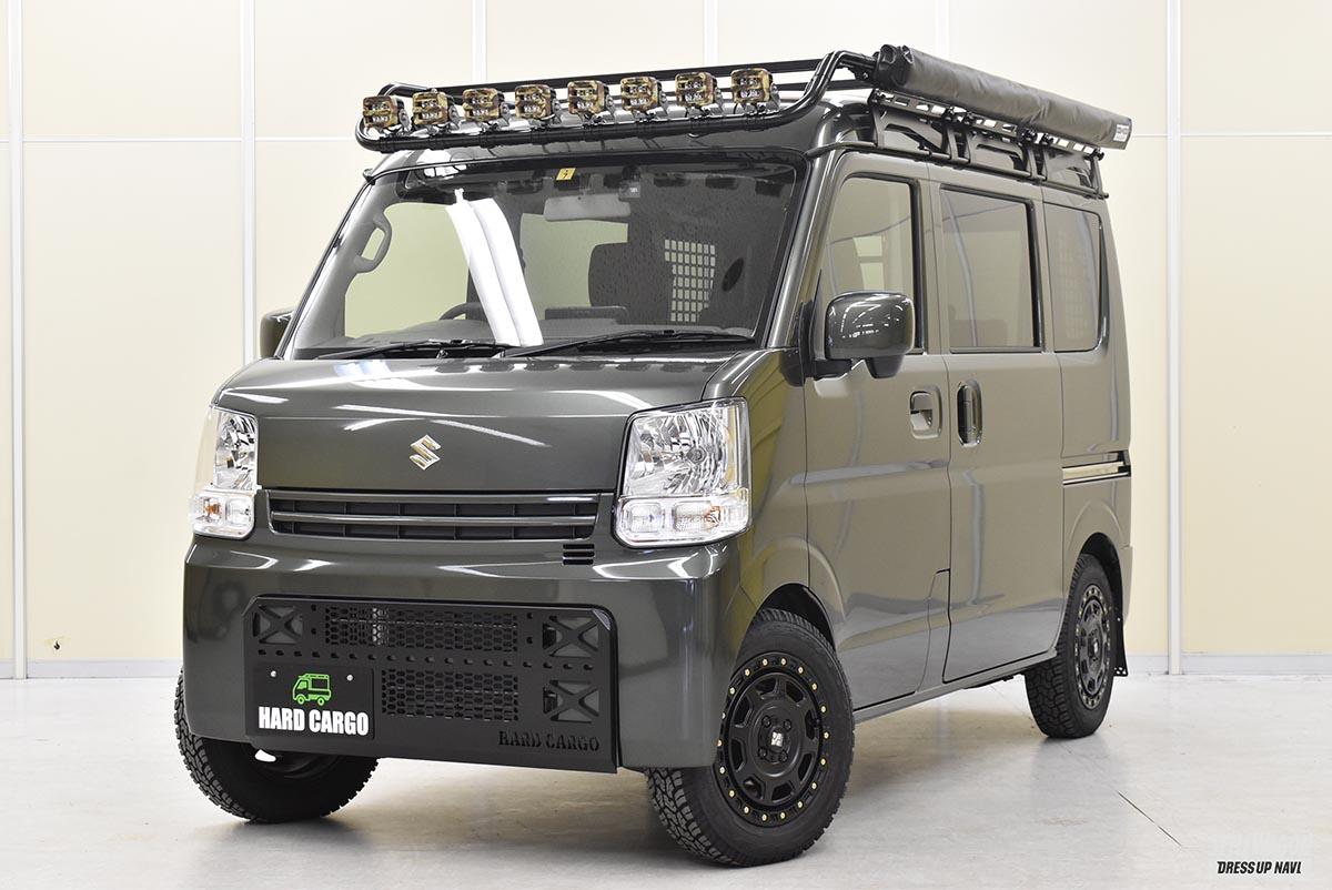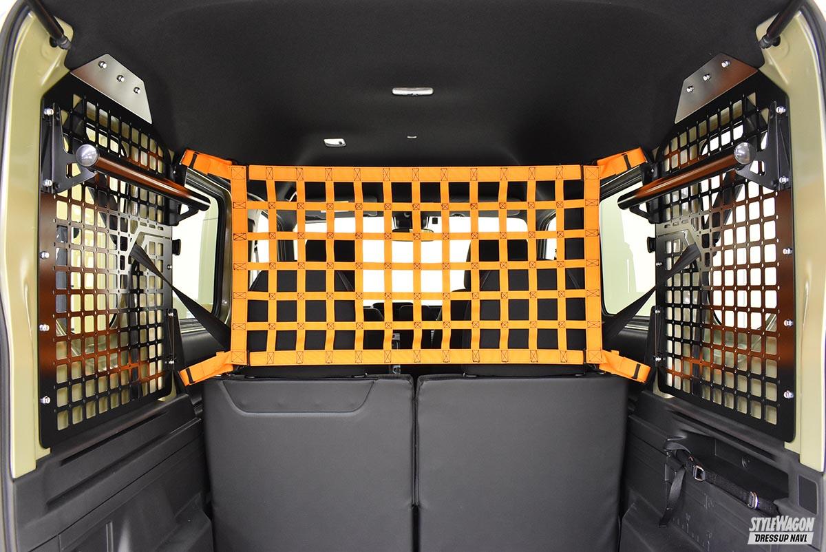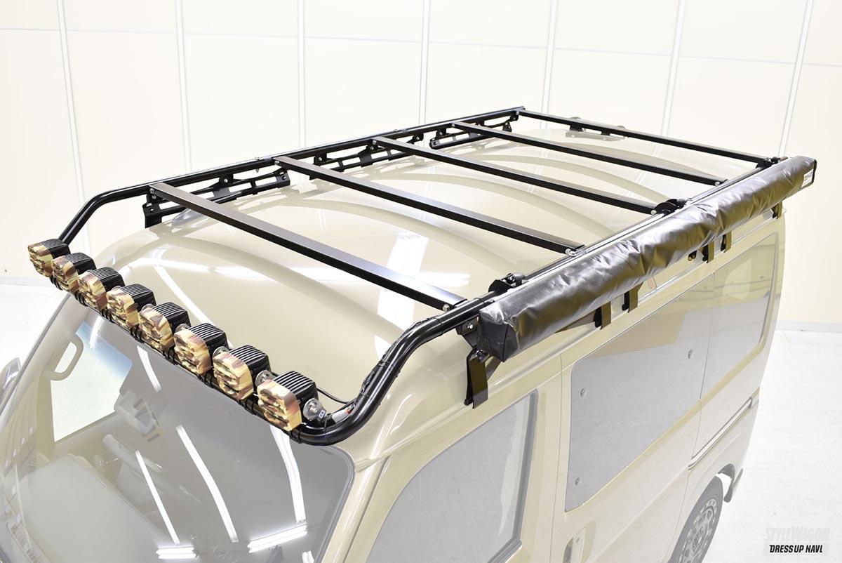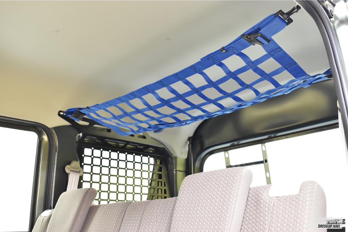 DA17のエブリイであれば、バンにもワゴンにも対応できるパーツがズラリ。38φのスチールパイプ製となるフラットキャリアは、耐荷重が50kgとたっぷり積んでも平気な仕様。走行時に風の抵抗を低減できるフェアリング、顔つきをガラリと変えられるスキッドグリルなど、機能性だけでなくビジュアル性にも長けたパーツが用意されている。アウトドアで便利なのがルーフネット。ルーフ部分にセットすればラゲッジの収納力をアップ可能。