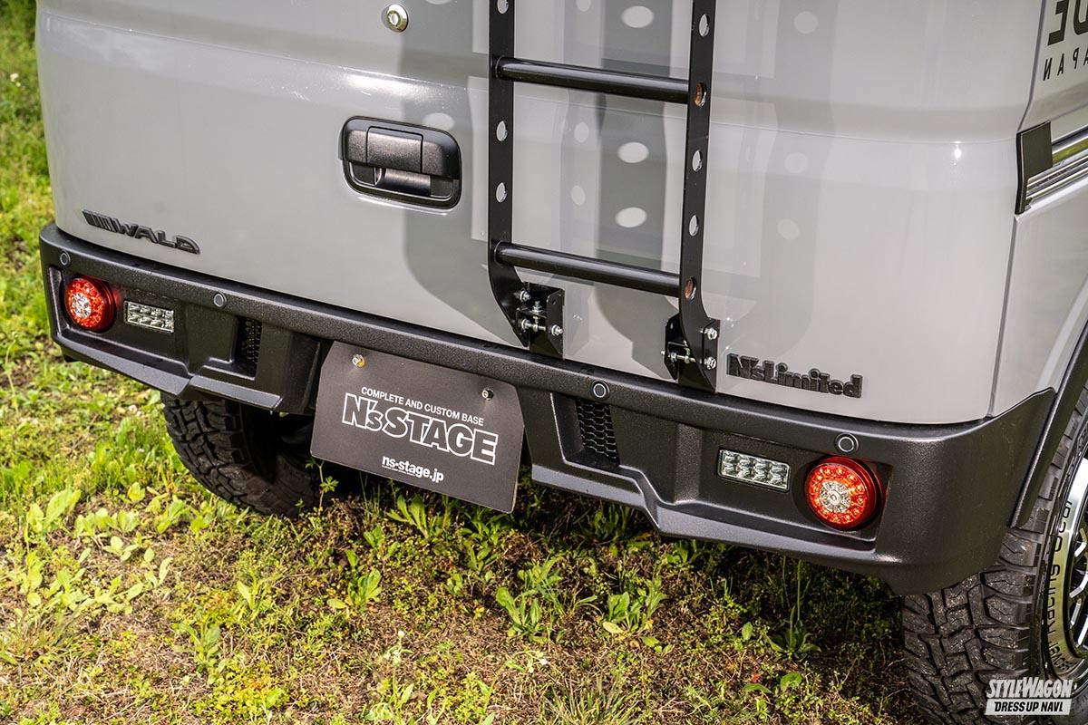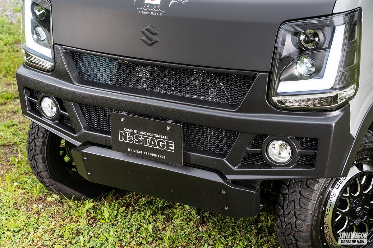 むろんエブリイバージョンのブラックバイソンに関してもデザインを手がけたのはヴァルドで、軽自動車の限られた規格のなかで最大限の造形美を追求。一般的にノッペリとしたデザインのエアロが多いなか、前後バンパーは凹凸を駆使した3D形状を実現。素材にスチールを用いることでタフに扱えるスキッドプレートに関しては、面構成に抑揚を与えることで立体感を演出している。このようにブラックバイソンのコンセプトを踏襲したワイルドな世界観はエブリイでも健在だ。