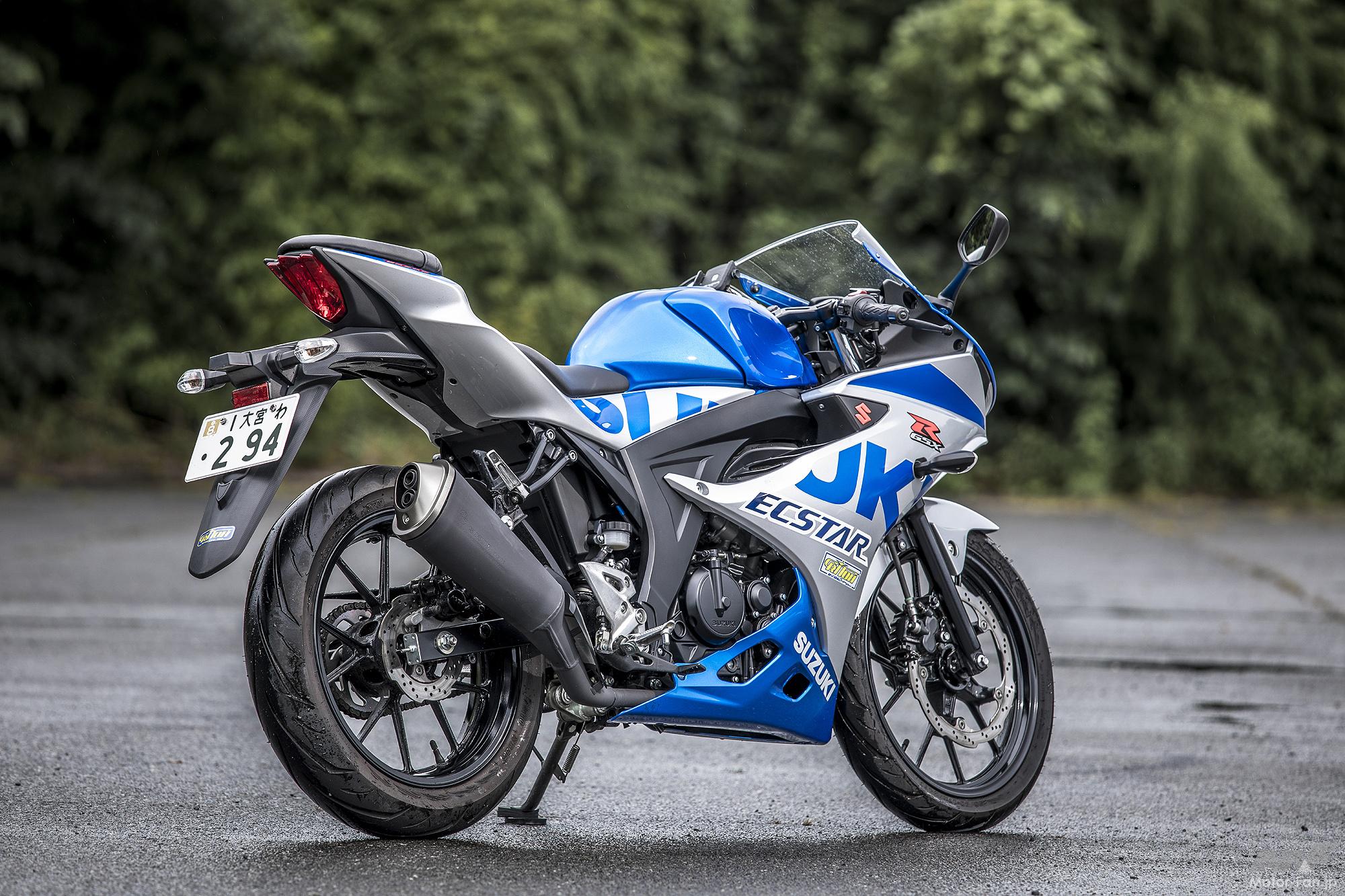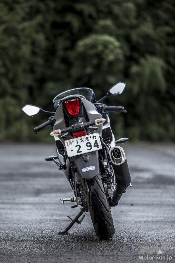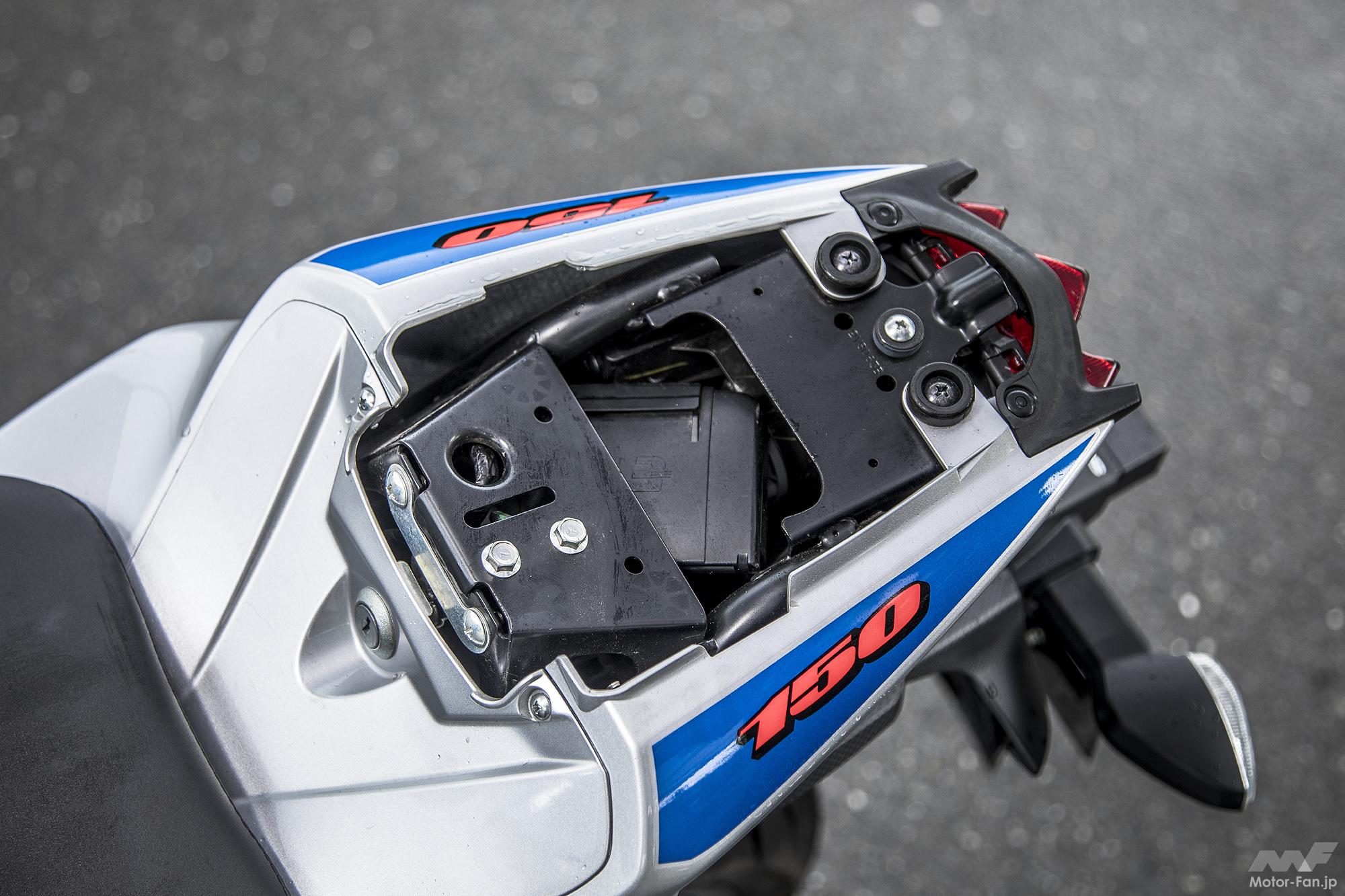 ちなみにGSX-R 125の最高出力は15PS/10,500rpmを発揮。同150は19.3PSを誇る。リッター当たり馬力に換算すると、前者は約121PS、後者は約131PSとなる。つまりGSX-R 150は同125よりもレベルの高い高出力が追求されているのである。