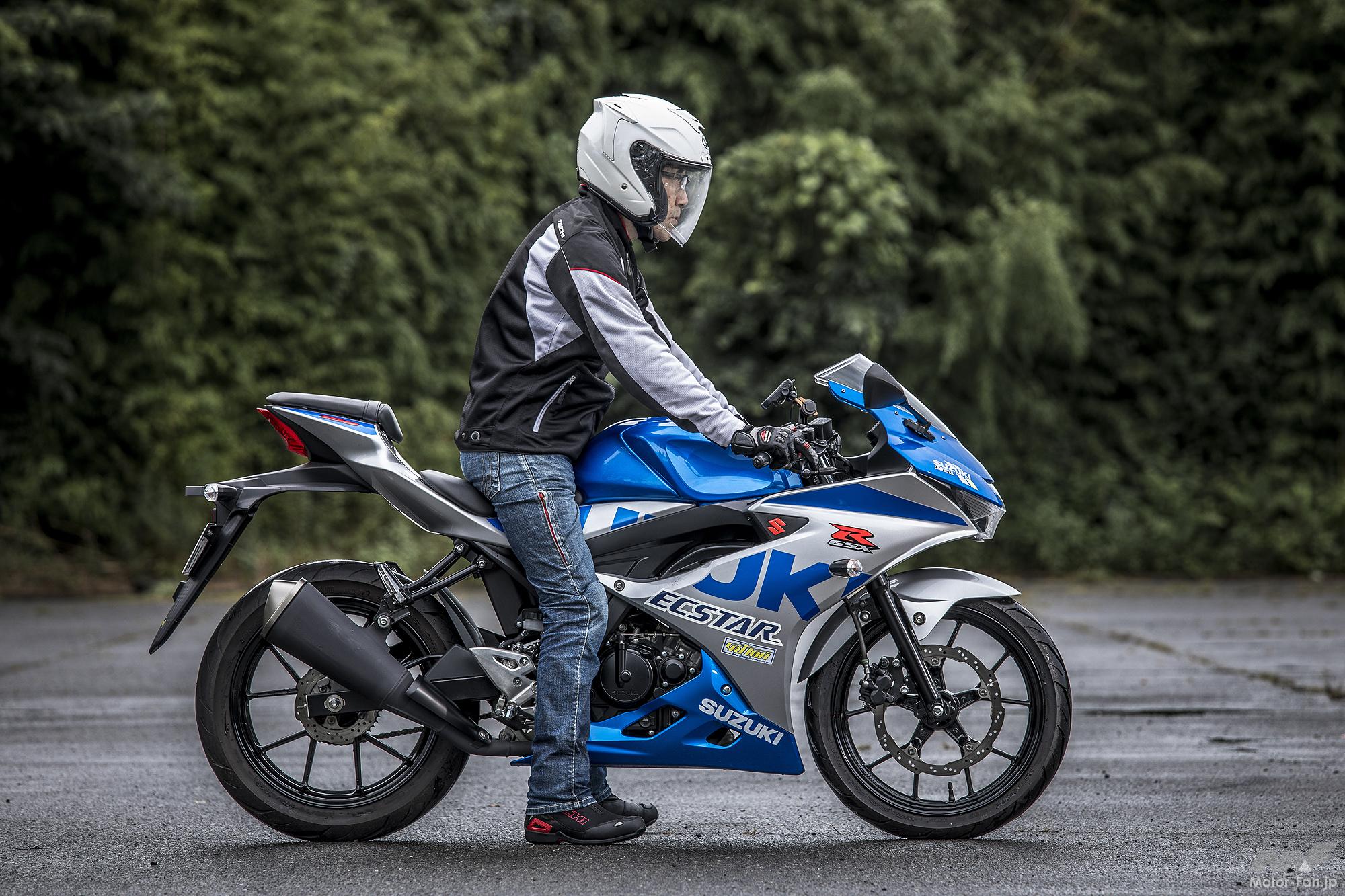 早速試乗車に股がると、程良い車体サイズと重さがとてもフレンドリー。ジクサー150と比較するとほぼ同等だが、GSX-R 150の方がフォルムはスマートで扱いも軽く感じられた。