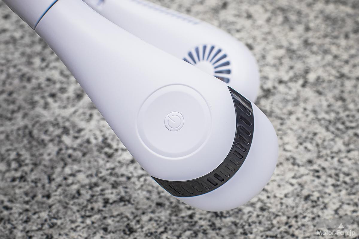 あやしいスタートとなってしまったが、バイクに使えれば、ひとまずは良し!ということで、気を取り直してインプレッションを続行。こちらの製品は国内では各社からリリースされている、最新設計の首掛け扇風機。独自の技術により、自然の風に近い空気の流れを実現。左右両側に32個の送風口を設置し、首や後頭部を涼しくしてくれるのが特徴だ。