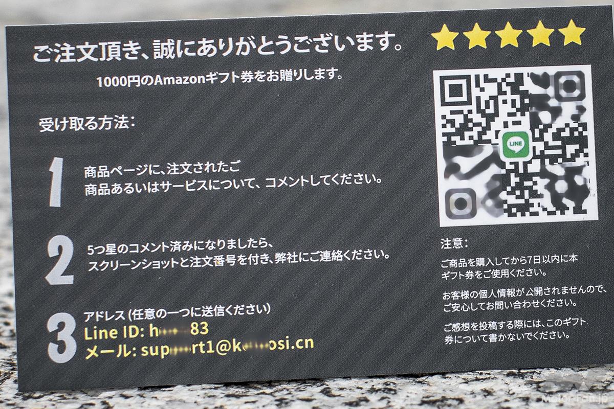 今回この製品を選んだ理由は、アマゾンレビューの評価が高かったから。それで届いたのが、こちらのパッケージ。開封すると……。「amazonギフト券」なるものがが入っていました。 アマゾンレビューに5つ星の評価とコメントを書き込み、その画像を出店者に送ると、1000円分のギフトがもらえるそうです。サクラレビューのイン●チキだったんですね。