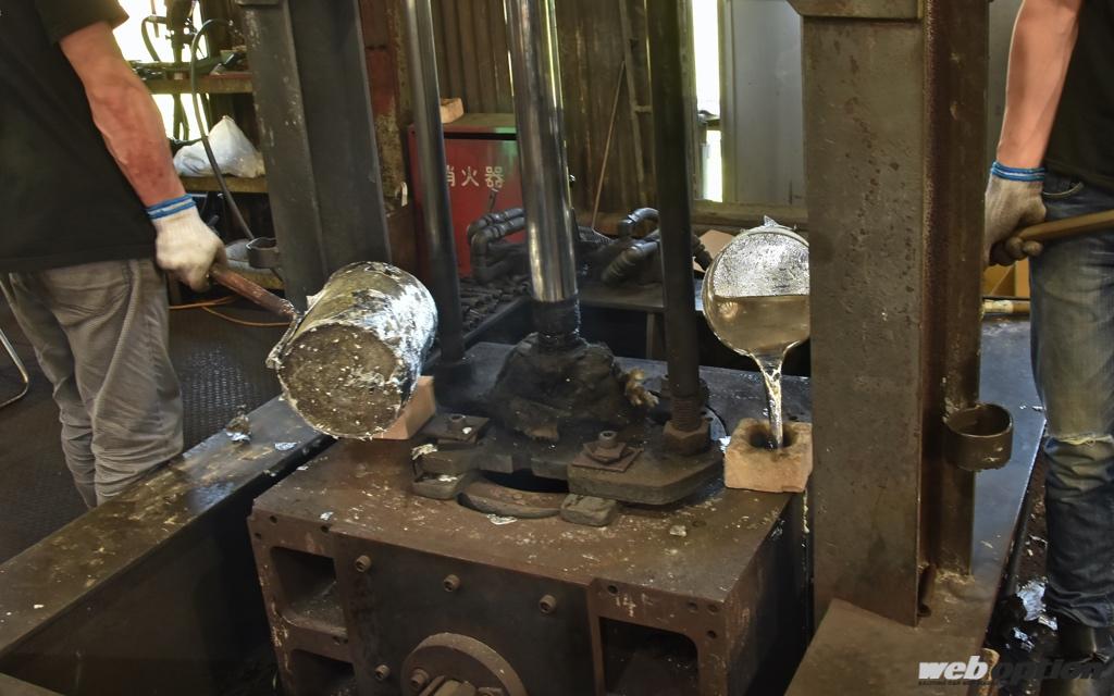 溶解したアルミをひしゃくで掬い、湯口から型へと流し込んでいく。こちらの画像は金型鋳造のものだが、溶解したアルミを型に流し込むのは砂型でも同じだ。