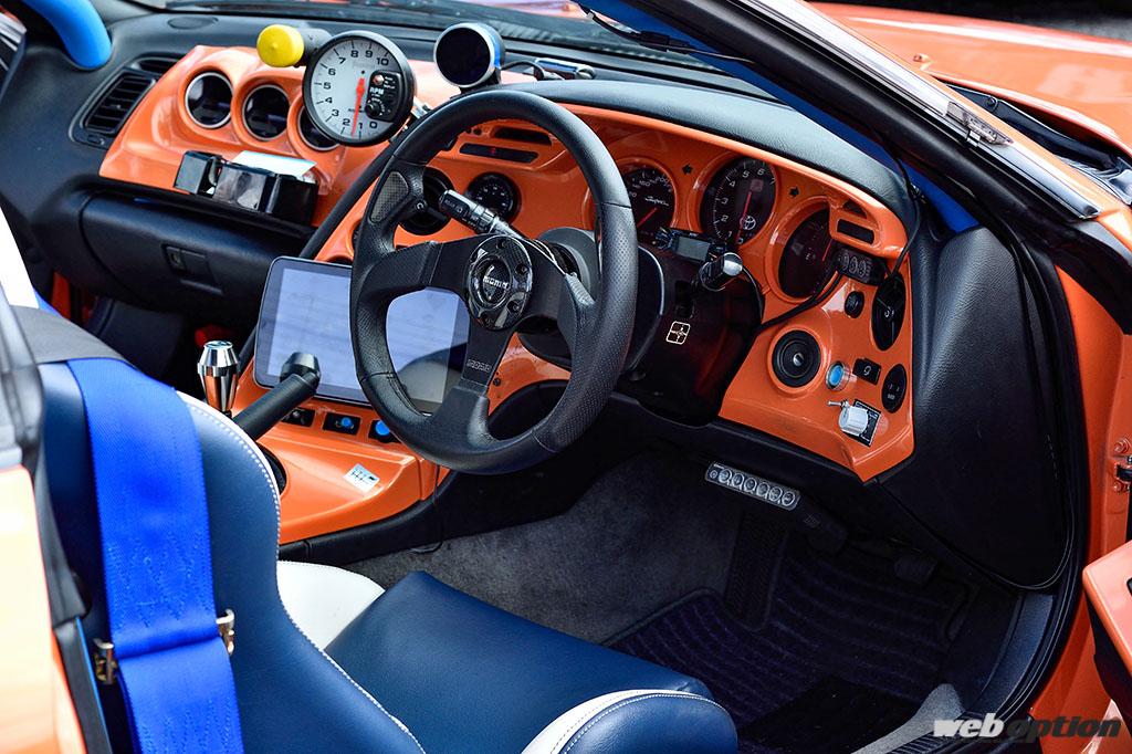 サイトウロールケージ製のクロモリロールケージが装備されているが、ストリートを快適に走れるドラッグ仕様というテーマで製作されているため、エアコンやオーディオも完備したインテリア。純正メーターは360km/h&10000rpmスケールに変更されている。シフトランプが付いた大型のタコメーターは、定番のオートメーター製。シートはレカロのSR-3だ。