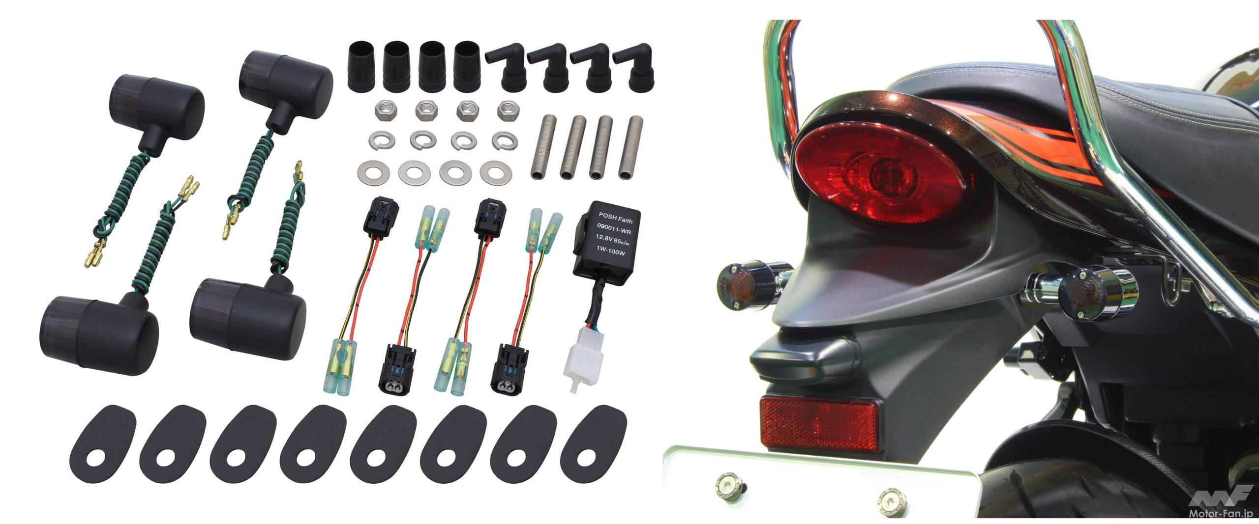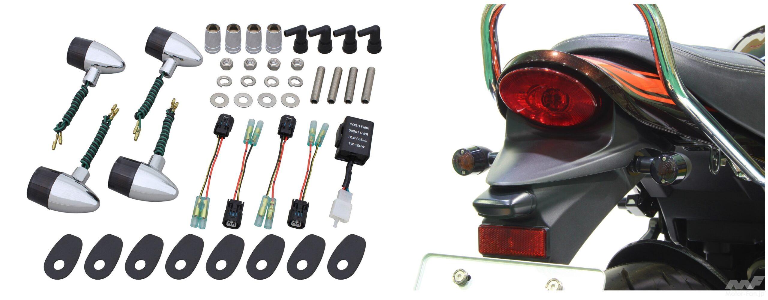 そんなわけで、ポッシュフェイスからウインカーキットが新登場! 定番の「砲弾タイプ」、旧車にもマッチする小振りなラウンド型の「71タイプ」、スポーティな「スリム&シャープ」、オーソドックスな「スーパーバイク」の4種類が揃い、レンズはスモークで、ボディはメッキorブラックボディから選べる。