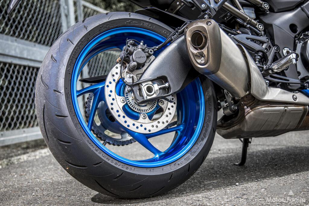 コーナーの進入ではそこそこのハードブレーキングでも車体は安定。寝かし始めではGSX-S1000Fのときに感じたフロント周りの重さはやや改善された感はあるが、それでも重量車らしい手応えを感じる。バンク中も前後サスペンションのバランスが良く、軽いギャップ程度なら無視できるほど。コーナーの出口ではパワフルかつスムーズな4気筒エンジンの特性を活かして豪快に脱出することもできる。その際、トラクションコントロールが搭載されていることは安心感につながる。もちろん過信し過ぎは禁物だが。