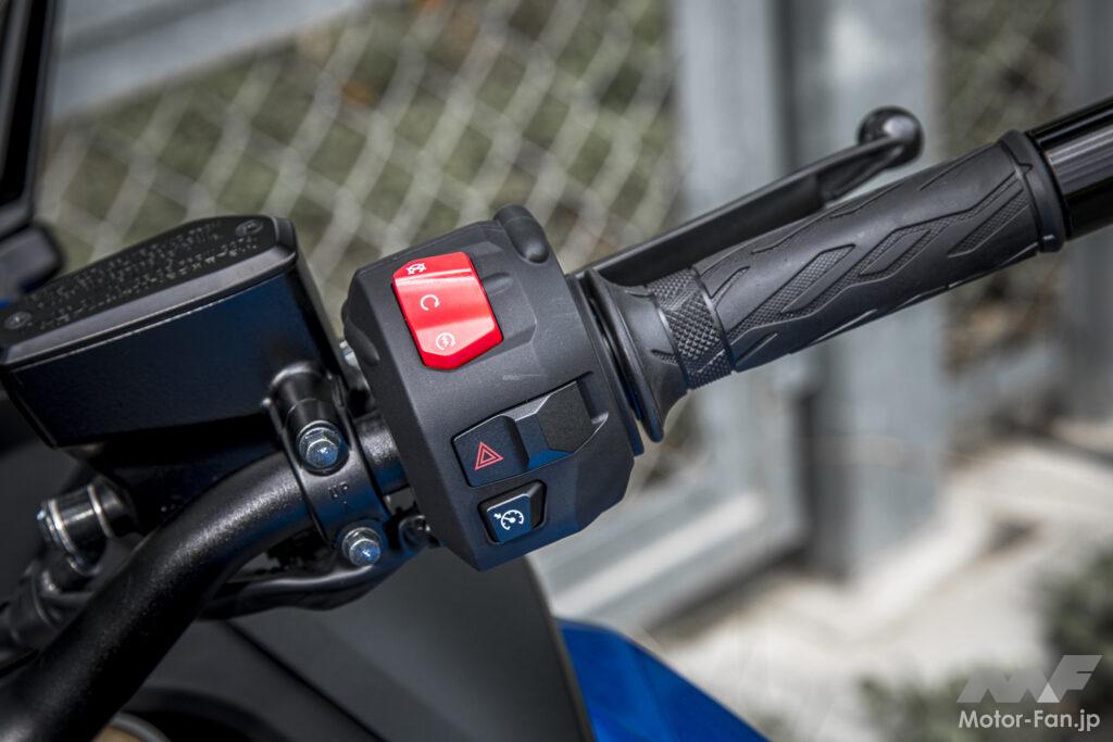 個人的に好みだったのはAモード。大柄な車体をキビキビと走らせることができ、コントロールから外れることもなかった。余談ではあるが、兄弟モデルのカタナに試乗したときはAモードだとアクセルへのツキが良すぎる感覚で、Bモードのほうが気分良く走れた。メーカーによると両車の電子制御システムのセッティングは同じだという。不思議に思ったが車重やサスセッティング、乗車位置、姿勢などが影響しているのだろう。