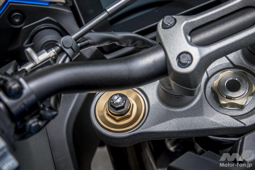 ツアラーだからコーナーリングは得意じゃないのではと思う人もいるかも知れないが、GSX-S1000GTにそれは当てはまらない。なにせエンジンはスーパースポーツ、車体はストリートファイター由来のものだ。フロントブレーキキャリパーはブレンボ、前後サスペンションはフルアジャスタブルと走りに対する装備を怠っていないことからも想像できる。